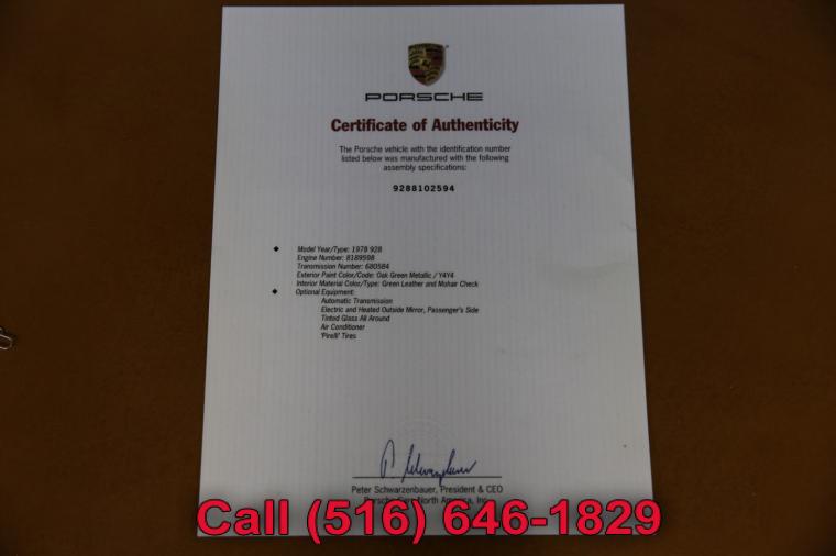 Here is a very special 1978 Porsche 928 Coupe. Finished with a VERY RARE Oak Green Metallic exterior and Green Leather and Mohair Check (Pasha) interior. Driven just 28,252 collector owned miles since new. Options on this 928 include an Automatic Transmission, Air Conditioning, Right Side Mirror, 16 Inch Phone Dial Wheels, Rear Wiper and much more. This 928 just underwent a major service within the last 100 miles that included oil and fluids, new timing belt, accessory belts, new tires and much more. The water cooled 8 cylinder engine is strong and powerful and the automatic transmission shifts properly through all of the gears. The steering is tight and precise and the brakes feel just great. All of the electronics are working properly as well. This really is a fantastic Porsche to drive. The interior is stunning. The Green Leather and Mohair Check (Pasha) seats and door cards are in remarkable condition (see pictures) showing just minimal wear to the seats. The factory Green dashboard is fantastic and even the carpets don't look or feel like they have been stepped on thanks to the Porsche floor mats that have been protecting them. The exterior is what really sets this particular Porsche 928 apart from the rest. The Oak Green Metallic paint is in fantastic condition (see pictures) with no major scratches or dings anywhere at all. The paint is bright and shiny with plenty of luster. Add the optional 16 inch wheels mounted on new tires and this Porsche really does look special. The 1978 Porsche 928 really is the ultimate collector Porsche. In 1978, this was Porsche's most expensive model and it was all named Europes Car Of The Year. A powerful and smooth engine along with refinement and comfort made this the ultimate touring car. The only real apologies to this 928 are a few imperfections on the driver seat bottom (see pictures) and a few typical nicks and light scratches (see pictures) that are to be expected on any used car. Please feel free to call me (Matt 516-646-1829) with any additional questions you may have.