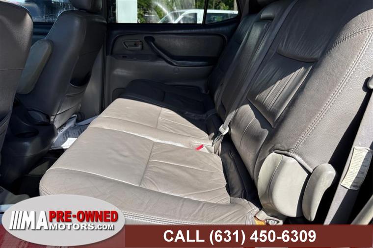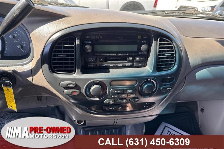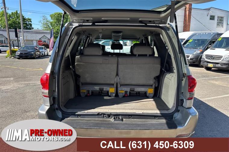 ABS, 4-Wheel Disc Brakes, 5-Speed A/T, 8 Cylinder Engine, A/C, A/T, 3rd Row Seat, Adjustable Steering Wheel, Security System, AM/FM Stereo, Automatic Headlights, Power Outlet, Brake Assist, Bucket Seats, CD Player, Child Safety Locks, Climate Control, Cruise Control, Driver Air Bag, Driver Vanity Mirror, Multi-Zone A/C, Stability Control, Front Reading Lamps, Conventional Spare Tire, Gasoline Fuel, Intermittent Wipers, Pass-Through Rear Seat, Passenger Air Bag, Passenger Air Bag Sensor, Passenger Vanity Mirror, Power Door Locks, Power Mirror(s), Power Driver Seat, Power Passenger Seat, Power Steering, Power Windows, Privacy Glass, Rear Bench Seat, Rear Defrost, Rear Wheel Drive, Tires - Front On/Off Road, Tires - Rear On/Off Road, Traction Control, Variable Speed Intermittent Wipers, Immobilizer, Color-keyed body side moldings & grille w/chrome inserts, Color-keyed bumpers, Color-keyed door handles, Color-keyed pwr mirrors, Mudguards, Multi-reflector headlamps w/auto off, Rear quarter & tailgate privacy glass, Variable intermittent front & rear wipers, (10) cupholders, 3-in-1 AM/FM stereo w/cassette/CD-inc: (6) speakers, 50/50 split fold-down reclining 3rd row bench seat w/tumble & slide feature, remove functions, adjustable headrests, 60/40 split fold-down 2nd row bench seat w/tumble & recline feature, adjustable headrests, Anti-theft system w/engine immobilizer, Cargo area 12-volt auxiliary pwr outlet, Cargo area grocery bag hooks, Courtesy lamps, Cruise control, Door map pockets, Dual sun visors w/vanity mirrors, sliding extensions, Dual zone front & rear digital auto climate control, Fabric-trimmed seats & door, Green illuminated analog instrument cluster-inc: tachometer, LCD twin trip odometers, In-glass antenna, Maplights, Multi-function floor console-inc: armrest storage box, (2) 12V pwr outlets, note pad holder, Pwr door locks, Pwr front captain chairs w/adjustable headrests, Pwr rear window w/defogger, Pwr windows w/front (1) touch up & down, jam control, Remote hood & fuel filler door releases, Tilt steering wheel w/cruise controls, Warning lights-inc: seatbelt, airbag, door ajar, battery, oil pressure, brake, check engine, low fuel, (5) P245/70R16 mud & snow tires, 130-amp alternator, 16" x 7.0" styled steel wheels, 26.4 gallon fuel tank, 4.7L DOHC 32-valve V8 i-Force VVT-i engine, 5-link live axle rear suspension w/coil-springs, 5-speed ECT-i automatic transmission w/OD, 6, 600# GVWR, Anti-lock brake system (ABS) w/brake assist, Electronic brakeforce distribution (EBD), Engine speed-sensing pwr rack & pinion steering, Front & rear stabilizer bars, low-pressure gas-filled shock absorbers, Independent double-wishbone front suspension w/coil-springs, Pwr 4-wheel ventilated disc brakes, Rear wheel drive, Traction control (TRAC), Vehicle stability control (VSC), 2nd/3rd row child restraint system (CRS) tether anchors bracket & ISO-FIX anchors, 3-point seat belts at all seating positions w/drivers emergency locking retractors (ELR), front passengers automatic locking retractors (ALR) & emergency locking retractors (ELR), Anti-lock brake system (ABS) w/brake assist, Child protector rear door locks, Driver & front passenger advanced airbags w/occupant classification system, Front energy-absorbing crumple zone, Front seat belt force limiters & pretensioners, Side-impact door beams, Traction control (TRAC), Vehicle stability control (VSC)
