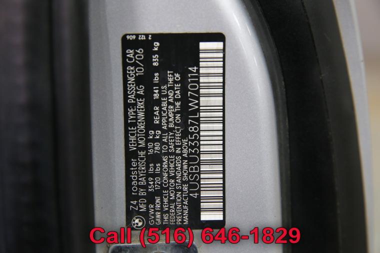 2007 BMW Z4 3.0i Roadster finished with a Titanium Silver Metallic exterior and Black leather interior. Driven just 40,746 careful miles since new. Options on this Z4 include a 6 Speed Steptronic Automatic Transmission, Heated Seats, High Definition Radio, Premium Package, Power Top and much more. This Z4 3.0i Roadster just underwent a complete oil and fluid service within the last 20 miles and it drives even better than it looks. The 6 cylinder engine is strong and powerful and the Steptronic automatic transmission shifts effortlessly through all of the gears. The steering is tight and precise and the brakes feel just great. All of the electronics work properly and the air conditioning is ice cold. This really is a fantastic BMW to drive. The interior is really nice. The Black leather seats are in excellent condition (see pictures) showing just minimal wear to the seats. The dashboard is like new and even the carpets don't look or feel like they have been stepped on thanks to the BMW floor mats that have been protecting them. The exterior is what really sets this particular Z4 3.0i apart from the rest. The Titanium Silver Metallic paint is in fantastic condition (see pictures) with no major scratches or dings anywhere at all. The paint is bright and shiny with plenty of luster. Add the optional alloy wheels mounted on great tires and this BMW really does look special. The 2007 BMW Z4 3.0i really is the ultimate roadster. It has fantastic looks and performance, a power convertible top for fun in the sun along with all of BMW's legendary safety, luxury and reliability. The only real apologies to this Z4 are a few typical nicks and chips (see pictures) that are to be expected on any used car. Please feel free to call me (Matt 516-646-1829) with any additional questions you may have.