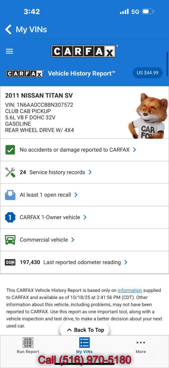 For more information on this 2011 Nissan Titan, please call Car Father at (516) 970-5180 or with the contact form on this page. This vehicle's vin number is 1N6AA0CC8BN307572 and is recorded as being in stock at Car Father at 4214 Austin Blvd in Island Park. See all cars from this dealership.