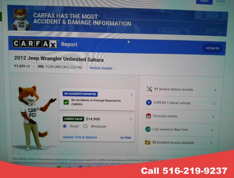 For more information on this 2012 Jeep Wrangler, please call South Shore Auto Brokers at (516) 219-9237 or with the contact form on this page. This vehicle's vin number is 1C4HJWEGXCL232780 and is recorded as being in stock at South Shore Auto Brokers at 104 Stone Blvd in Massapequa. See all cars from this dealership.