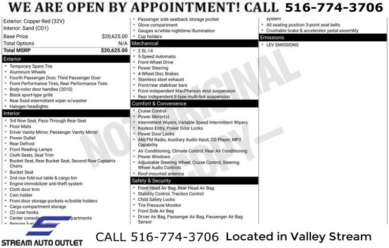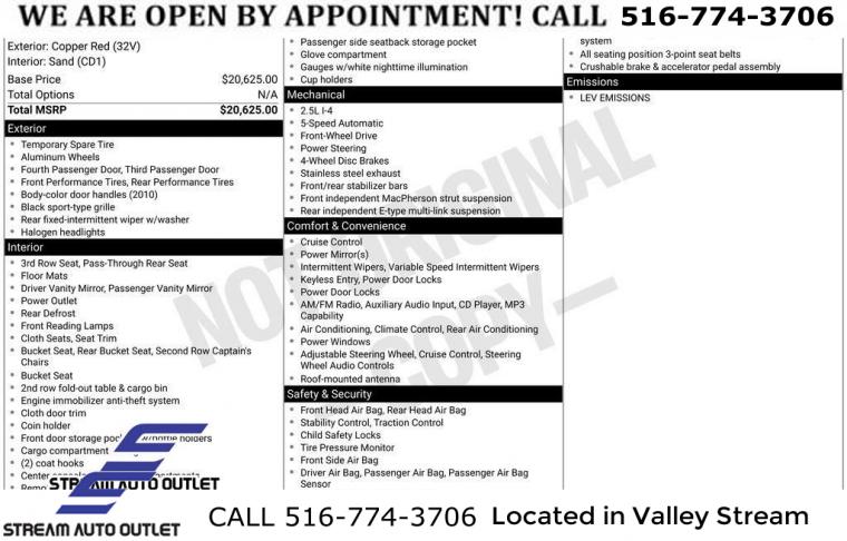 6 Speakers, AM/FM radio, AM/FM/CD/MP3 Audio System w/6 Speakers, CD player, Air Conditioning, Automatic temperature control, Rear air conditioning, Rear window defroster, Power steering, Power windows, Remote keyless entry, Steering wheel mounted audio controls, Four wheel independent suspension, Speed-sensing steering, Traction control, 4-Wheel Disc Brakes, ABS brakes, Dual front impact airbags, Dual front side impact airbags, Front anti-roll bar, Low tire pressure warning, Occupant sensing airbag, Overhead airbag, Rear anti-roll bar, Brake assist, Electronic Stability Control, Cloth Seat Upholstery, Panic alarm, Speed control, Bumpers: body-color, Power door mirrors, Driver door bin, Driver vanity mirror, Front reading lights, Illuminated entry, Outside temperature display, Passenger vanity mirror, Tachometer, Telescoping steering wheel, Tilt steering wheel, 3rd row seats: split-bench, Front Bucket Seats, Reclining Bucket Seats, Passenger door bin, 16" x 6.5J Alloy Wheels, Alloy wheels, Rear window wiper, Variably intermittent wipers, * NYS INSPECTION INCLUDED *, * FULL INTERIOR / EXTERIOR DETAIL *, * BLUETOOTH *, * LIMITED NYS LEMON LAW WARRANTY INCLUDED *, *FRESH OIL CHANGE *, * 150 MULTI POINT INSPECTION *
