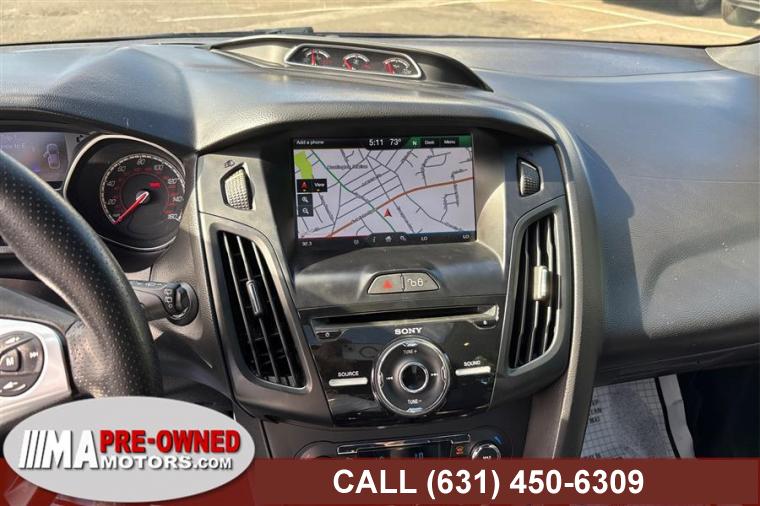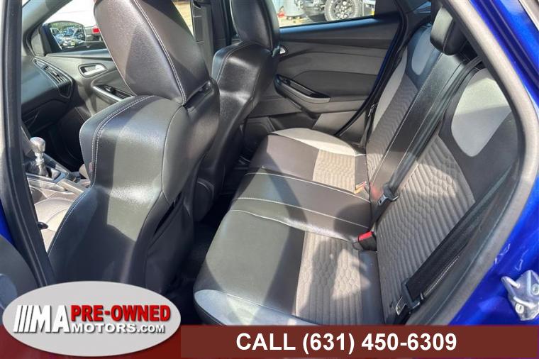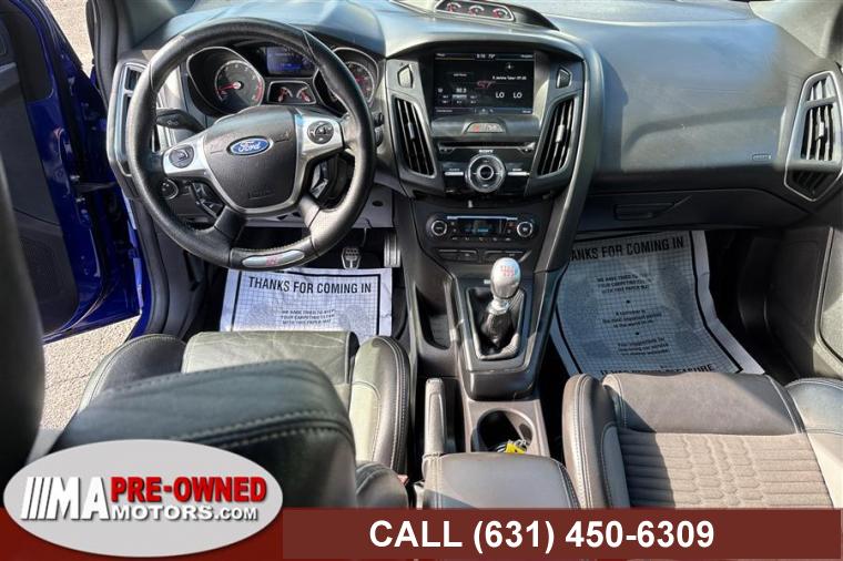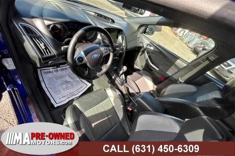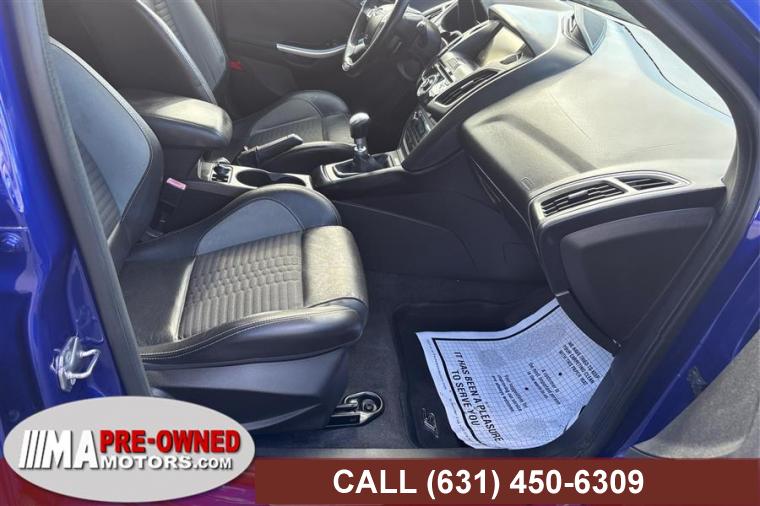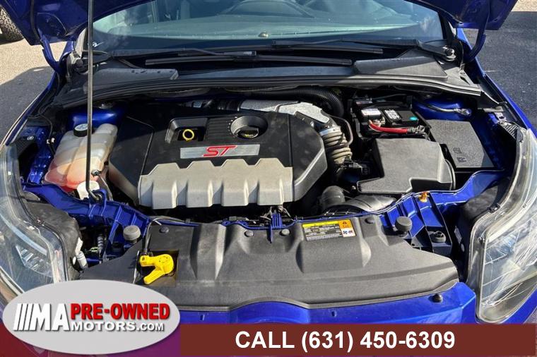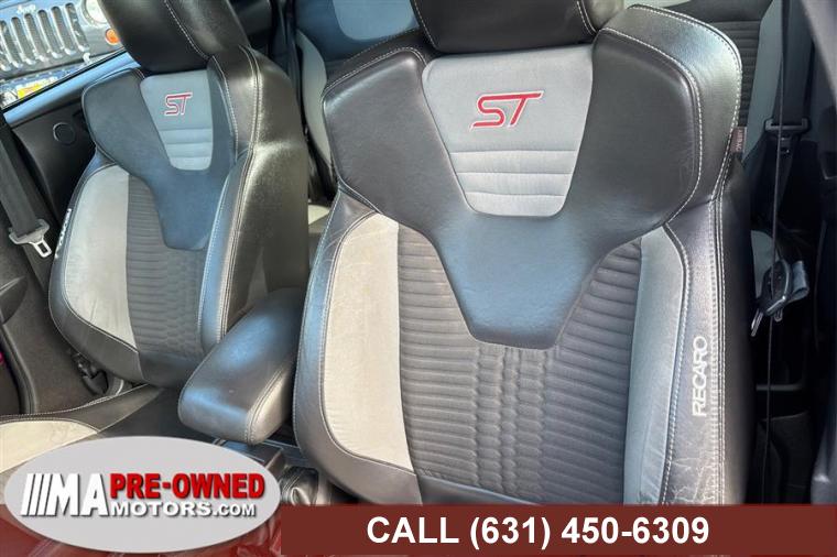 4 Cylinder Engine, ABS, 4-Wheel Disc Brakes, 6-Speed M/T, A/C, Adjustable Steering Wheel, Security System, Aluminum Wheels, AM/FM Stereo, Auxiliary Audio Input, Power Outlet, Bucket Seats, CD Player, Child Safety Locks, Cruise Control, Driver Air Bag, Driver Illuminated Vanity Mirror, Driver Vanity Mirror, Stability Control, Fog Lamps, Floor Mats, Front Wheel Drive, Conventional Spare Tire, Gasoline Fuel, Integrated Turn Signal Mirrors, Intermittent Wipers, Keyless Entry, Keyless Start, Knee Air Bag, Leather Steering Wheel, M/T, MP3 Player, Telematics, Pass-Through Rear Seat, Passenger Air Bag, Passenger Air Bag Sensor, Passenger Illuminated Visor Mirror, Passenger Vanity Mirror, Power Door Locks, Power Mirror(s), Power Steering, Power Windows, Rear Bench Seat, Rear Side Air Bag, Rear Defrost, Rear Head Air Bag, Rear Spoiler, Front Side Air Bag, Front Head Air Bag, Steering Wheel Audio Controls, Tire Pressure Monitor, Tires - Front Performance, Tires - Rear Performance, Traction Control, Trip Computer, Turbocharged, Variable Speed Intermittent Wipers, Engine Immobilizer, Bluetooth Connection, 18" aluminum wheels, 18" Y-rated summer tires, Body kit w/lower valances & rocker moldings, Body-color bumpers, Body-color door handles, Body-color pwr mirrors -inc: integrated turn signals, spotter mirrors, illuminated entry lamps, Chin spoiler, Fog lamps, Full size spare tire, Halogen reflector headlamps w/darkened headlamps, Piano black grille, Rear spoiler, Rear wiper, Variable intermittent wipers, (2) 12V pwr points, (2) front cupholders, 60/40 split rear bench seat w/center adjustable headrest, Aluminum pedals, Anti-theft engine immobilizer, Cloth front bucket seats, Cruise control, Dual illuminated visors, Front door storage bins, Front reading light, Front/rear floor mats, Front/rear/cargo dome lights, Full floor center console w/storage & armrest, Illuminated entry, Instrument cluster -inc: trip computer, outside temp display, compass, turbo boost pressure, 4.2" color display, Intelligent access w/push button start, Leather shifter -inc: red stitching, Leather-wrapped steering wheel, Manual air conditioning w/air filtration system, Perimeter alarm, Pwr door locks, Pwr windows w/1-touch up/down front windows, Rear coat hooks, Rear seat map pockets, Rear window defroster, Remote keyless entry, Tilt/telescopic steering column, Unique IP finish panels, Unique ST scuff plates, 2.0L GTDI I4 EcoBoost engine, 4-wheel pwr disc brakes, 6-speed manual transmission, Dual bright tipped exhaust, Easy Fuel capless fuel-filler system, Electric pwr assist rack & pinion steering, Front wheel drive, Independent rear suspension, Rear stabilizer bar, Unique ST sport suspension, 3-point front safety belts -inc: height-adjustable, retractable, pretensioners, Anti-lock brakes (ABS), Driver knee airbag, Dual stage front airbags, Electronic stability control, Front/rear side curtain airbags, Front/rear side-impact airbags, Hill launch assist, MyKey system -inc: top speed limiter, audio volume limiter, early low fuel warning, programmable sound chimes, Belt Minder w/audio mute, Passenger occupant detection system (PODS), Rear door child safety locks, Tire pressure monitoring system