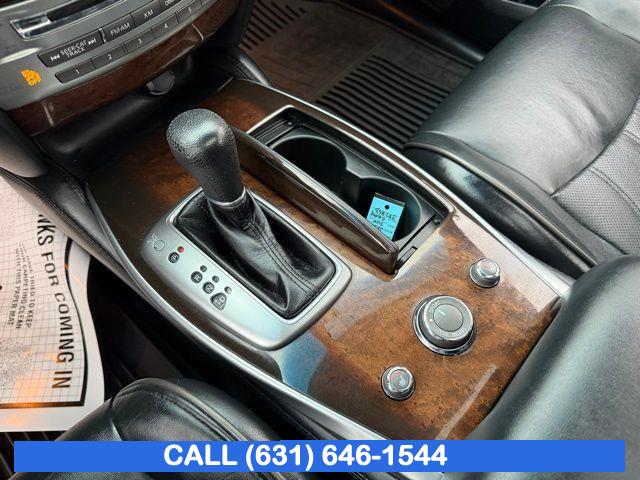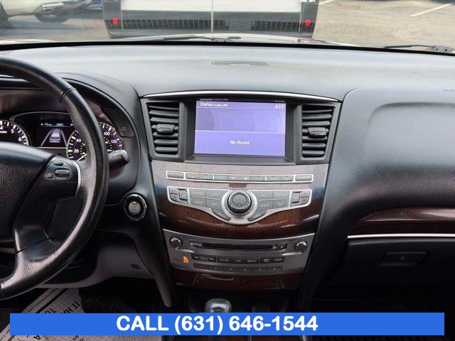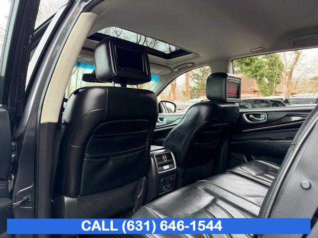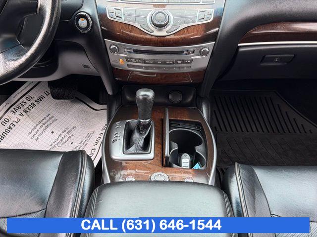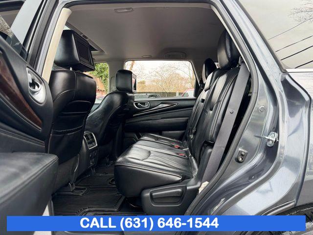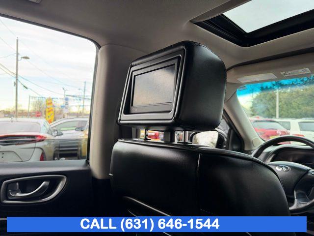 Cargo Package, Maple Interior Trim, Premium Package, Theater Package, 6 Speakers, AM/FM radio: SiriusXM, AM/FM/CD/MP3 Audio System, CD player, INFINITI Voice Recognition, Radio data system, Radio: INFINITI Hard Drive Navigation System, Wireless Headphones (2), Air Conditioning, Automatic temperature control, Front dual zone A/C, Rear air conditioning, Rear window defroster, Power driver seat, Power steering, Power windows, Remote keyless entry, Steering wheel mounted audio controls, Entry & Exit Assist, Four wheel independent suspension, Speed-sensing steering, Traction control, 4-Wheel Disc Brakes, ABS brakes, Dual front impact airbags, Dual front side impact airbags, Front anti-roll bar, Low tire pressure warning, Occupant sensing airbag, Overhead airbag, Rear anti-roll bar, Power moonroof, Dual 7" Color Monitors, Power Liftgate, Around View Monitor w/Front & Rear Sonar System, Brake assist, Electronic Stability Control, Exterior Parking Camera Rear, Delay-off headlights, Front fog lights, Fully automatic headlights, High intensity discharge headlights: Bi-Xenon, First Aid Kit, Panic alarm, Security system, Speed control, Bodyside moldings, Bumpers: body-color, Heated door mirrors, Illuminated Kick Plates (PIO) (DISC), Outside Mirrors w/Reverse Tilt-Down Feature, Power door mirrors, Splash Guards (Color-Matched Set of 4), Spoiler, 120V Power Outlet, Auto-Dimming Inside Mirror, Driver door bin, Driver vanity mirror, Enhanced Intelligent Key Memory, Front reading lights, Illuminated entry, Leather Shift Knob, Leather steering wheel, Maple Interior Accents, Outside temperature display, Overhead console, Passenger vanity mirror, Rear Cargo Protector, Rear reading lights, Rear seat center armrest, Tachometer, Telescoping steering wheel, Tilt steering wheel, Trip computer, 2-Way Driver's Seat Power Lumbar Support, 3rd row seats: bench, Dual Occupant Memory System, Front Bucket Seats, Heated Front Seats, Heated front seats, Leather-Appointed Seats, Power passenger seat, Reclining 3rd row seat, Split folding rear seat, Front Center Armrest w/Storage, Passenger door bin, Roof Rail Cross Bars, Roof Rails, Tonneau Cover, 18" Split 5-Spoke Aluminum-Alloy Wheels, Alloy wheels, Rear window wiper, Speed-Sensitive Wipers, Variably intermittent wipers, 5.17 Axle Ratio