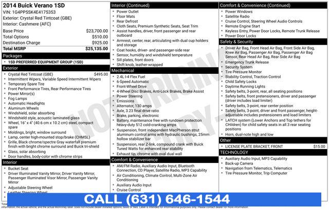 For more information on this 2014 Buick Verano, please call Stream Auto Outlet Islip at (631) 646-1544 or with the contact form on this page. This vehicle's vin number is 1G4PP5SK4E4175353 and is recorded as being in stock at Stream Auto Outlet Islip at 2232 Sunrise Hwy in Islip. See all cars from this dealership.
