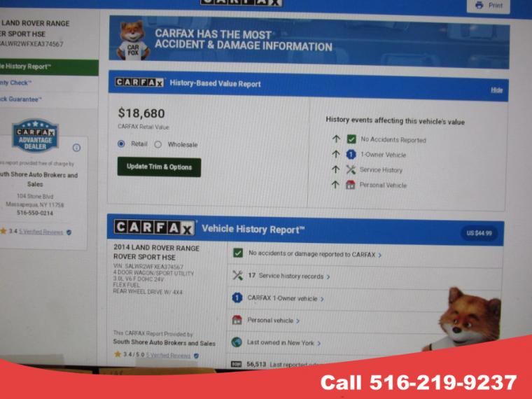 For more information on this 2014 Land Rover Range Rover Sport, please call South Shore Auto Brokers at (516) 219-9237 or with the contact form on this page. This vehicle's vin number is SALWR2WFXEA374567 and is recorded as being in stock at South Shore Auto Brokers at 104 Stone Blvd in Massapequa. See all cars from this dealership.