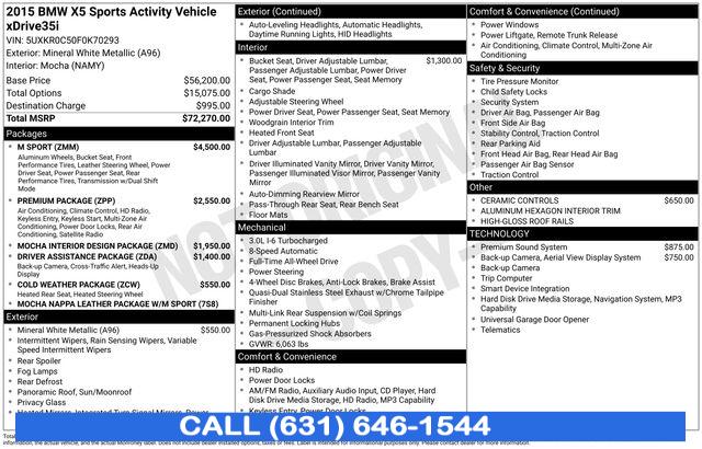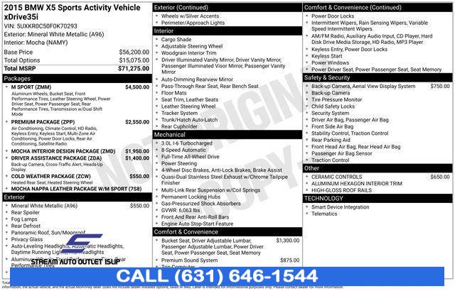 2015 BMW X5 White Metallic Mocha Leather, CD player, Heated Front Seats, Heated Rear Seats, Navigation System, Navigation System w/Touchpad, Power Front Seats w/Driver Seat Memory, Power moonroof, Rear-view Camera. Odometer is 510 miles below market average! 18/27 City/Highway MPG