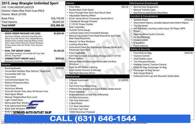 For more information on this 2015 Jeep Wrangler, please call Stream Auto Outlet Islip at (631) 646-1544 or with the contact form on this page. This vehicle's vin number is 1C4HJWDG0FL663229 and is recorded as being in stock at Stream Auto Outlet Islip at 2232 Sunrise Hwy in Islip. See all cars from this dealership.