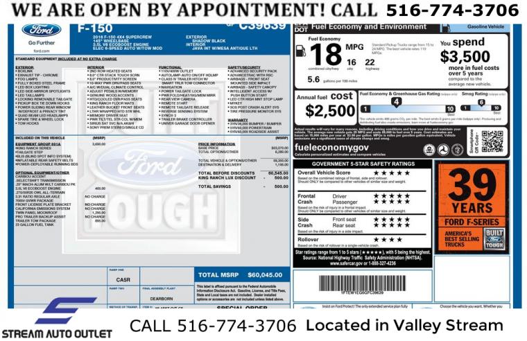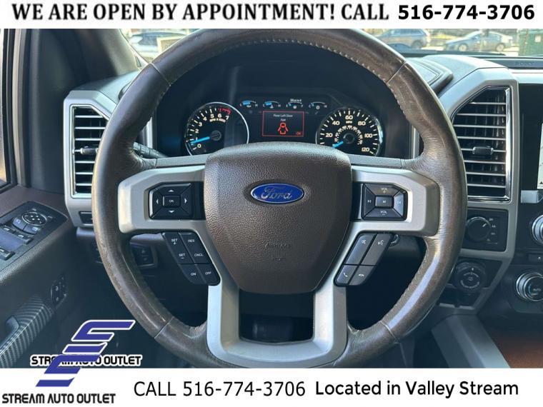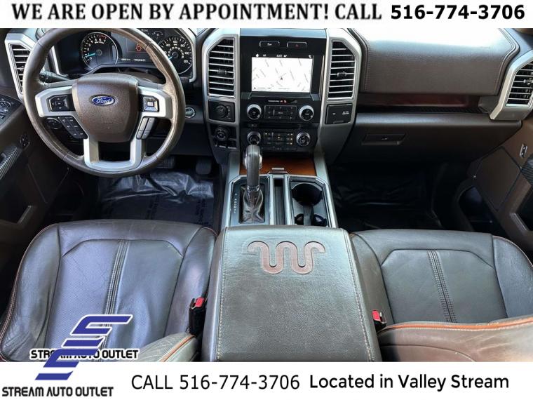 Navigation System, Voice-Activated Navigation, Equipment Group 601A Luxury, Trailer Tow Package, 10 Speakers, AM/FM radio: SiriusXM, CD player, Radio data system, Radio: Sony Single CD w/HD & SiriusXM Satellite, Air Conditioning, Automatic temperature control, Auxiliary Transmission Oil Cooler, Front dual zone A/C, Rear window defroster, Memory seat, Pedal memory, Power driver seat, Power steering, Power windows, Remote keyless entry, Steering wheel memory, Steering wheel mounted audio controls, Speed-sensing steering, Traction control, Upgraded Front Stabilizer Bar, 4-Wheel Disc Brakes, ABS brakes, Dual front impact airbags, Dual front side impact airbags, Front anti-roll bar, Front wheel independent suspension, Low tire pressure warning, Occupant sensing airbag, Overhead airbag, Twin Panel Moonroof, BLIS Blind Spot Information System, Brake assist, Electronic Stability Control, Exterior Parking Camera Rear, Rear Parking Sensors, Delay-off headlights, Front fog lights, Fully automatic headlights, Inflatable Rear Safety Belts, Panic alarm, Security system, Speed control, Auto-dimming door mirrors, Bumpers: chrome, Front License Plate Bracket, Heated door mirrors, Power door mirrors, Power-Deployable Running Boards, Rear step bumper, Tailgate Step w/Tailgate Lift Assist, Turn signal indicator mirrors, Adjustable pedals, Auto tilt-away steering wheel, Auto-dimming Rear-View mirror, Compass, Driver door bin, Driver vanity mirror, Front reading lights, Garage door transmitter, Genuine wood dashboard insert, Genuine wood door panel insert, Heated steering wheel, Illuminated entry, King Ranch Leather Bucket Seats, Outside temperature display, Overhead console, Passenger vanity mirror, Pro Trailer Backup Assist, Rear reading lights, Rear seat center armrest, SYNC 3, Tachometer, Telescoping steering wheel, Tilt steering wheel, Trip computer, Voltmeter, Front Bucket Seats, Front Center Armrest, Heated front seats, Heated rear seats, Multi-Contour Driver & Passenger Seats, Power passenger seat, Split folding rear seat, Ventilated front seats, Passenger door bin, Class IV Trailer Hitch Receiver, Integrated Trailer Brake Controller, 18" Machined-Aluminum Wheels, 20" Machined-Aluminum Wheels, Alloy wheels, Auto High Beam w/Rain-Sensing Windshield Wipers, Variably intermittent wipers, 3.31 Axle Ratio, * NYS INSPECTION INCLUDED *, * FULL INTERIOR / EXTERIOR DETAIL *, * BLUETOOTH *, * LIMITED NYS LEMON LAW WARRANTY INCLUDED *, *FRESH OIL CHANGE *, * 150 MULTI POINT INSPECTION *
