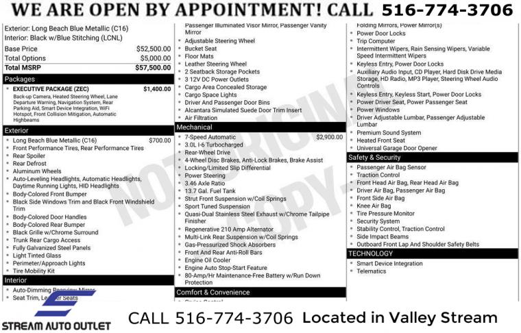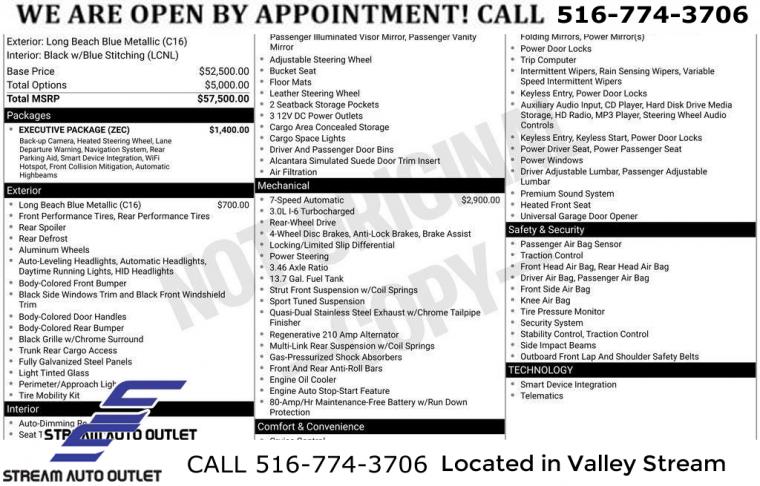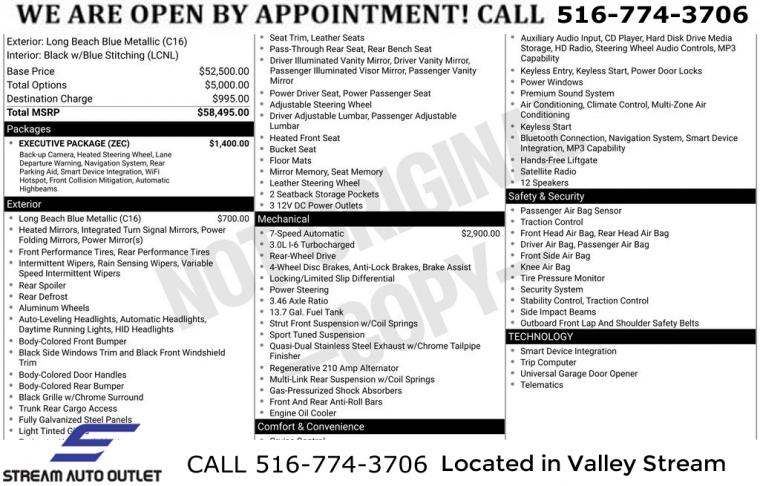 * NYS INSPECTION INCLUDED *, * FULL INTERIOR / EXTERIOR DETAIL *, * BLUETOOTH *, * LIMITED NYS LEMON LAW WARRANTY INCLUDED *, *FRESH OIL CHANGE *, * 150 MULTI POINT INSPECTION *, Active Driving Assistant, Automatic High Beams, EXECUTIVE PKG, Heated Steering Wheel, Navigation System, Park Distance Control (Rear), Radio: On-Board Navigation, Rear-View Camera, Speed Limit Info, WiFi Hotspot, Wireless Charging.