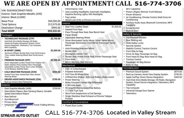 3.385 Axle Ratio, Wheels: 18" x 8.0" Double Spoke (Style 605), Wheels: 19" x 8.5" M Double Spoke (Style 622M), Power Front Bucket Seats, Sport Seats, Heated Front Seats, SensaTec Leatherette Upholstery, Anti-Theft AM/FM Stereo CD/MP3 Player, Rear-View Camera, Fineline Anthracite Wood Trim, Surround View, Navigation System, harman/kardon Surround Sound System, Apple CarPlay Compatibility, Standard Suspension, Heated Steering Wheel, Comfort Access Keyless Entry, Without Lines Designation Outside, Lumbar Support, Heated Rear Seats, Retractable Headlight Washers, Park Distance Control, Head-Up Display, HD Radio, SiriusXM Satellite Radio, Hi-Fi Sound System, BMW Online & BMW Apps, Advanced Real-Time Traffic Information, Remote Services, Enhanced USB & Bluetooth, M Steering Wheel, Aerodynamic Kit, Shadowline Exterior Trim, Anthracite Headliner, Increased Top Speed Limiter, BMW Connected App Compatibility, Instrument Cluster w/Extended Contents, 4-Wheel Disc Brakes, Emergency communication system: BMW Assist eCall, High intensity discharge headlights: Bi-xenon, Speed-Sensitive Wipers, Auto-dimming Rear-View mirror, Front beverage holders, Variably intermittent wipers, Turn signal indicator mirrors, Trip computer, Traction control, Tilt steering wheel, Telescoping steering wheel, Steering wheel mounted audio controls, Sport steering wheel, Split folding rear seat, Speed-sensing steering, Speed control, Security system, Remote keyless entry, Rear window defroster, Rear seat center armrest, Rear reading lights, Rear fog lights, Rear anti-roll bar, Rain sensing wipers, Radio data system, Power windows, Power steering, Power passenger seat, Power moonroof, Power driver seat, Power door mirrors, Passenger vanity mirror, Passenger door bin, Panic alarm, Overhead airbag, Outside temperature display, Occupant sensing airbag, Memory seat, Low tire pressure warning, Leather steering wheel, Illuminated entry, Genuine wood console insert, Garage door transmitter, Fully automatic headlights, Front reading lights, Front fog lights, Front dual zone A/C, Front anti-roll bar, Four wheel independent suspension, Dual front side impact airbags, Dual front impact airbags, Driver vanity mirror, Driver door bin, Delay-off headlights, CD player, Bumpers: body-color, Brake assist, Bodyside moldings, Automatic temperature control, Auto-dimming door mirrors, Anti-whiplash front head restraints, Alloy wheels, AM/FM radio, ABS brakes, Tachometer, Rear Parking Sensors, Power Liftgate, Front Center Armrest, Front Bucket Seats, Electronic Stability Control, Air Conditioning, 9 Speakers