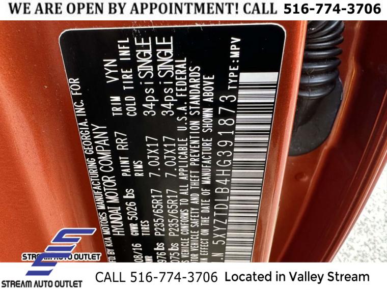 For more information on this 2017 Hyundai Santa Fe, please call Stream Auto Outlet Valley Stream at (516) 774-3706 or with the contact form on this page. This vehicle's vin number is 5XYZTDLB4HG391873 and is recorded as being in stock at Stream Auto Outlet Valley Stream at 324 W Merrick Rd in Valley Stream. See all cars from this dealership.