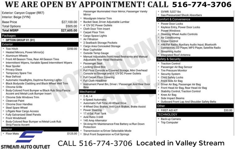 Option Group 01, 6 Speakers, AM/FM radio: SiriusXM, CD player, Radio: AM/FM/SiriusXM/CD/MP3 Audio System, Air Conditioning, Rear window defroster, Power steering, Power windows, Remote keyless entry, Steering wheel mounted audio controls, Four wheel independent suspension, Speed-sensing steering, Traction control, 4-Wheel Disc Brakes, ABS brakes, Dual front impact airbags, Dual front side impact airbags, Front anti-roll bar, Knee airbag, Low tire pressure warning, Occupant sensing airbag, Overhead airbag, Rear anti-roll bar, Brake assist, Electronic Stability Control, Exterior Parking Camera Rear, Delay-off headlights, Fully automatic headlights, First Aid Kit, Panic alarm, Security system, Speed control, Bumpers: body-color, Heated door mirrors, Power door mirrors, Spoiler, Carpeted Floor Mats, Driver door bin, Driver vanity mirror, Front reading lights, Illuminated entry, Multi-Adjustable Bucket Seats, Outside temperature display, Overhead console, Passenger vanity mirror, Rear seat center armrest, Tachometer, Telescoping steering wheel, Tilt steering wheel, Trip computer, Front Bucket Seats, Front Center Armrest, Split folding rear seat, Stain-Resistant Cloth Seating Surfaces, Passenger door bin, Tow Hitch, 17" x 7" Alloy Wheels, Alloy wheels, Rear window wiper, Variably intermittent wipers, Axle Ratio 3.648, * NYS INSPECTION INCLUDED *, * FULL INTERIOR / EXTERIOR DETAIL *, * BLUETOOTH *, * LIMITED NYS LEMON LAW WARRANTY INCLUDED *, *FRESH OIL CHANGE *, * 150 MULTI POINT INSPECTION *