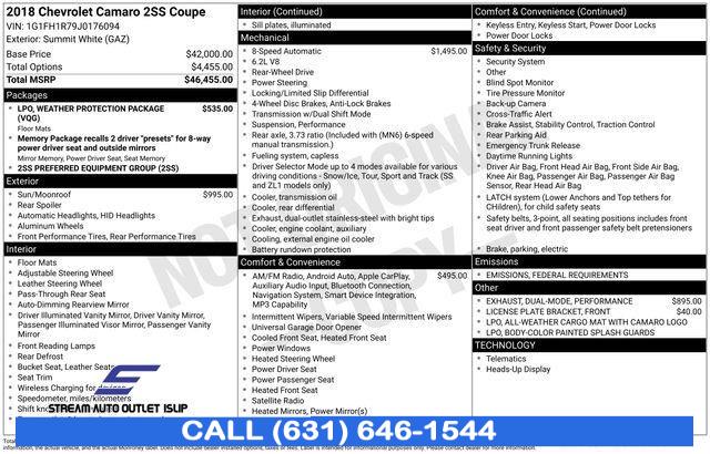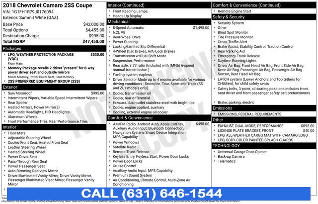 2018 Chevrolet Camaro Summit White Apple CarPlay/Android Auto, Bose Premium 9-Speaker Audio System Feature, Front License Plate Bracket, Heated door mirrors, Heated front seats, Heated steering wheel, Paddle-Shift Manual Controls, Power Sunroof, Preferred Equipment Group 2SS, Radio: Chevrolet MyLink w/Navigation, SiriusXM Satellite Radio. 17/27 City/Highway MPG