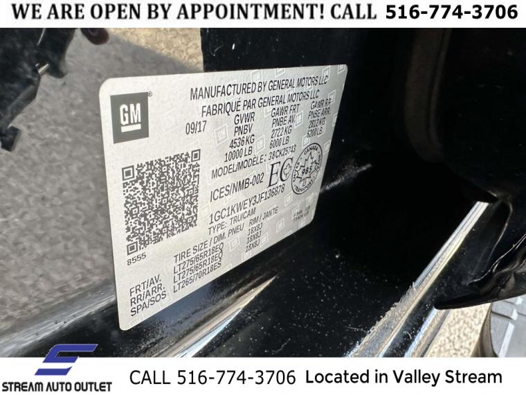 For more information on this 2018 Chevrolet Silverado, please call Stream Auto Outlet Valley Stream at (516) 774-3706 or with the contact form on this page. This vehicle's vin number is 1GC1KWEY3JF136878 and is recorded as being in stock at Stream Auto Outlet Valley Stream at 324 W Merrick Rd in Valley Stream. See all cars from this dealership.