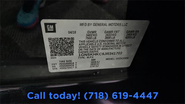 Enhanced Driver Alert Package, License Plate Front Mounting Package, Preferred Equipment Group 1LT, Premium Smooth Ride Suspension Package, 9 Speakers, AM/FM radio: SiriusXM, Bose Premium Audio System Feature, CD player, Floor Console w/Storage Area, HD Radio, Radio: Chevrolet MyLink AM/FM Stereo, Radio: Chevrolet MyLink AM/FM Stereo w/Navigation, Single-Slot CD/MP3 Player, SiriusXM Satellite Radio, Air Conditioning, Automatic temperature control, Front dual zone A/C, Rear air conditioning, Rear window defroster, 12-Volt Auxiliary Power Outlet (5), 6-Way Power Front Passenger Seat Adjuster, Memory seat, Memory Settings, Pedal memory, Power driver seat, Power steering, Power windows, Power-Adjustable Accelerator & Brake Pedals, Remote keyless entry, Steering wheel mounted audio controls, Universal Home Remote, Speed-sensing steering, Traction control, 4-Wheel Antilock Disc Brakes, 4-Wheel Disc Brakes, ABS brakes, Dual front impact airbags, Dual front side impact airbags, Emergency communication system: OnStar Guidance, Front anti-roll bar, Front wheel independent suspension, Low tire pressure warning, Occupant sensing airbag, Overhead airbag, Rear anti-roll bar, Remote Vehicle Start, Power Liftgate, Brake assist, Electronic Stability Control, Exterior Parking Camera Rear, Auto High-beam Headlights, Delay-off headlights, Fully automatic headlights, Driver Inboard & Front Passenger Airbags, Extended-Range Remote Keyless Entry, Panic alarm, Security system, Electronic Cruise Control w/Set & Resume Speed, Speed control, Black Assist Steps, Bumpers: body-color, Heated door mirrors, Intellibeam Headlamps w/Automatic High Beam On/Off, Power door mirrors, Roof rack: rails only, Spoiler, 1st & 2nd Row Color-Keyed Carpeted Floor Mats, Adjustable pedals, Apple CarPlay/Android Auto, Auto-Dimming Inside Rear-View Mirror, Auto-dimming Rear-View mirror, Color-Keyed Carpeting Floor Covering, Compass, Driver door bin, Driver vanity mirror, Forward Collision Alert, Front reading lights, Garage door transmitter, Illuminated entry, Lane Keep Assist w/Lane Departure Warning, Leather-Wrapped Steering Wheel, Low Speed Forward Automatic Braking, OnStar Basic Plan For 5 Years, Outside temperature display, Overhead console, Passenger vanity mirror, Rear Park Assist w/Audible Warning, Rear reading lights, Rear seat center armrest, Safety Alert Seat, SiriusXM NavTraffic, Tachometer, Telescoping steering wheel, Tilt steering wheel, Trip computer, Voltmeter, 2nd Row 60/40 Split-Folding Manual Bench, 3rd Row Manual 60/40 Split-Folding Fold Flat Bench, 3rd row seats: split-bench, Front Bucket Seats, Front Center Armrest, Heated Front Reclining Bucket Seats, Heated front seats, Leather-Appointed Seat Trim, Power passenger seat, Split folding rear seat, Passenger door bin, Roof-Mounted Luggage Rack Side Rails, 18" x 8.5" High-Polished Aluminum Finish Wheels, Alloy wheels, Rain sensing wipers, Rear window wiper, Variably intermittent wipers, 3.08 Rear Axle Ratio