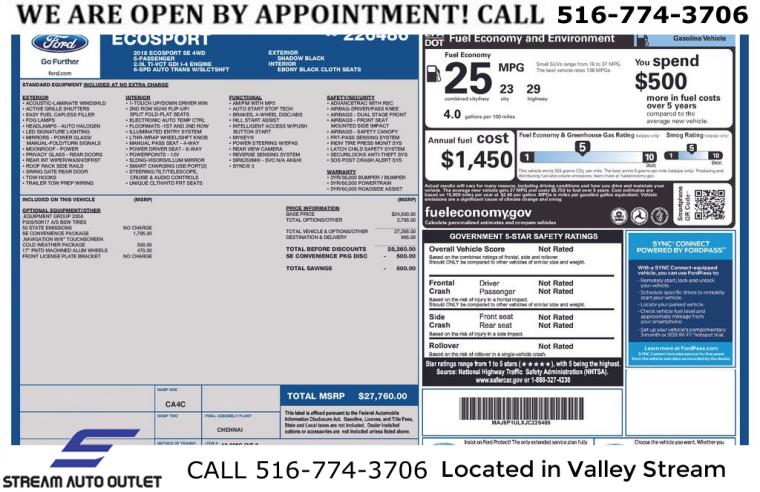 For more information on this 2018 Ford Ecosport, please call Stream Auto Outlet Valley Stream at (516) 774-3706 or with the contact form on this page. This vehicle's vin number is MAJ6P1ULXJC226486 and is recorded as being in stock at Stream Auto Outlet Valley Stream at 324 W Merrick Rd in Valley Stream. See all cars from this dealership.
