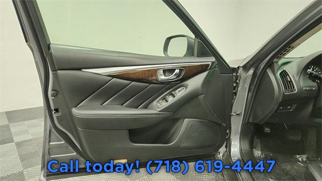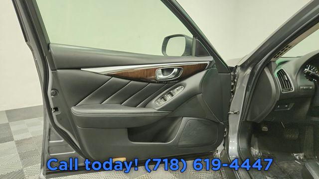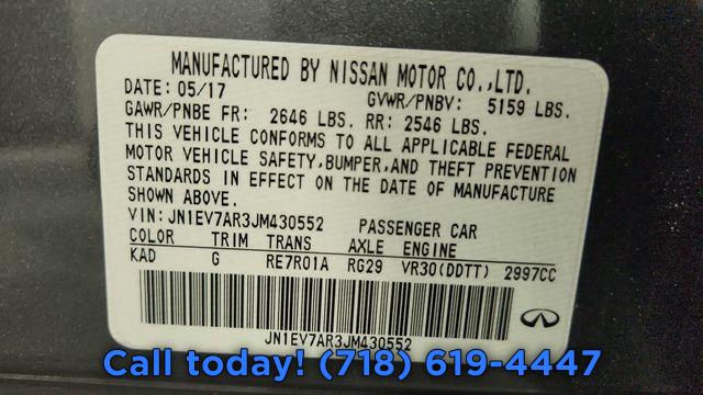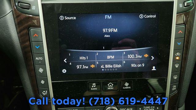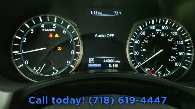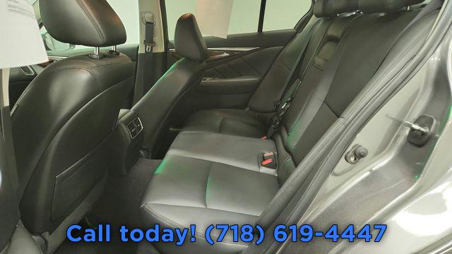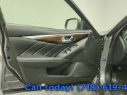 Navigation System, Essential Package (3.0t LUXE), 6 Speakers, AM/FM radio: SiriusXM, CD player, Radio data system, Radio: AM/FM/CD w/MP3 Playback Capability, Air Conditioning, Automatic temperature control, Front dual zone A/C, Rear window defroster, 60/40 Split-Folding Rear Seats, Power driver seat, Power steering, Power windows, Remote Engine Start, Remote keyless entry, Steering wheel mounted audio controls, Four wheel independent suspension, Speed-sensing steering, Traction control, 4-Wheel Disc Brakes, ABS brakes, Anti-whiplash front head restraints, Dual front impact airbags, Dual front side impact airbags, Front anti-roll bar, Low tire pressure warning, Occupant sensing airbag, Overhead airbag, Rear anti-roll bar, Power moonroof, Brake assist, Electronic Stability Control, Delay-off headlights, Front fog lights, Fully automatic headlights, Panic alarm, Security system, Speed control, Bumpers: body-color, Heated door mirrors, Power door mirrors, Turn signal indicator mirrors, Activation Disclaimer, Auto-dimming Rear-View mirror, Compass, Driver door bin, Driver vanity mirror, Front reading lights, Garage door transmitter: HomeLink, Genuine wood console insert, Genuine wood dashboard insert, Genuine wood door panel insert, Heated Steering Wheel, Illuminated entry, INFINITI InTouch Navigation System, Leather Shift Knob, Leather steering wheel, Literature Kit, Outside temperature display, Overhead console, Passenger vanity mirror, Rear reading lights, Rear seat center armrest, Tachometer, Telescoping steering wheel, Tilt steering wheel, Trip computer, Driver Seat Power Lumbar, Front Bucket Seats, Front Center Armrest, Heated Front Seats, Leatherette Seating Surfaces, Power passenger seat, Passenger door bin, 18" x 7.5" Aluminum Alloy Wheels, Alloy wheels, Rain sensing wipers, Speed-Sensitive Wipers, Variably intermittent wipers