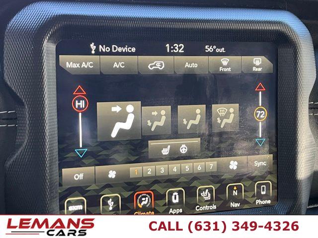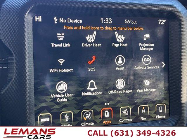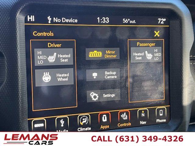 ABS, 4-Wheel Disc Brakes, A/C, Adjustable Steering Wheel, Security System, Aluminum Wheels, AM/FM Stereo, Automatic Headlights, Auxiliary Audio Input, Back-Up Camera, Brake Actuated Limited Slip Differential, Brake Assist, Bucket Seats, Child Safety Locks, Climate Control, Cruise Control, Daytime Running Lights, Driver Air Bag, Driver Illuminated Vanity Mirror, Driver Adjustable Lumbar, Driver Vanity Mirror, Multi-Zone A/C, Stability Control, Fog Lamps, Four Wheel Drive, Floor Mats, Tow Hooks, Conventional Spare Tire, Gasoline Fuel, Heated Mirrors, Intermittent Wipers, Keyless Entry, Keyless Start, Leather Steering Wheel, MP3 Capability, Pass-Through Rear Seat, Passenger Air Bag, Passenger Air Bag Sensor, Passenger Illuminated Visor Mirror, Passenger Vanity Mirror, Power Door Locks, Power Mirror(s), Power Steering, Power Windows, Privacy Glass, Rear Bench Seat, Requires Subscription, Rollover Protection Bars, Running Boards/Side Steps, Satellite Radio, Front Side Air Bag, Smart Device Integration, Steering Wheel Audio Controls, Tire Pressure Monitor, Traction Control, Trip Computer, Universal Garage Door Opener, V6 Cylinder Engine, Variable Speed Intermittent Wipers, Immobilizer, Bluetooth Connection, Aluminum Spare Wheel, Auto On/Off Reflector Halogen Daytime Running Headlamps w/Delay-Off, Black Door Handles, Black Front Bumper w/Metal-Look Rub Strip/Fascia Accent and 2 Tow Hooks, Black Power Heated Side Mirrors w/Manual Folding, Black Rear Bumper w/1 Tow Hook, Black Side Windows Trim, Black Wheel Well Trim and Body-Colored Fender Flares, Body-Colored Grille w/Chrome Accents, Deep Tinted Glass, Front Fog Lamps, Full-Size Spare Tire Mounted Outside Rear, Galvanized Steel/Aluminum/Magnesium Panels, Manual Convertible Top w/Fixed Roll-Over Protection and Top, Non-Lock Fuel Cap w/o Discriminator, Removable Rear Window, Side Steps, Swing-Out Rear Cargo Access, Tailgate/Rear Door Lock Included w/Power Door Locks, Tires: 255/70R18 All Season, Variable Intermittent Wipers, Wheels: 18" x 7.5" Polished w/Gray Spokes, 2 12V DC Power Outlets, 2 12V DC Power Outlets and 1 Interior 120V AC Power Outlet, 2 Seatback Storage Pockets, 4-Way Passenger Seat -inc: Manual Recline and Fore/Aft Movement, 6-Way Driver Seat -inc: Manual Recline, Height Adjustment, Fore/Aft Movement and Manual Lumbar Support, 60-40 Folding Split-Bench Front Facing Fold Forward Seatback Cloth Rear Seat, Air Filtration, Analog Appearance, Cargo Space Lights, Carpet Floor Trim, Carpet And Rubber Mat, Cloth Low-Back Bucket Seats, Compass, Cruise Control w/Steering Wheel Controls, Day-Night Rearview Mirror, Delayed Accessory Power, Driver And Passenger Visor Vanity Mirrors w/Driver And Passenger Illumination, Driver Information Center, Fade-To-Off Interior Lighting, Front And Rear Map Lights, Front Center Armrest w/Storage, Front Seats w/Cloth Back Material and Manual Driver Lumbar, Full Carpet Floor Covering -inc: Carpet Front And Rear Floor Mats, Full Floor Console w/Locking Storage, 2 12V DC Power Outlets and 1 Interior 120V AC Power Outlet, Garage Door Transmitter, Gauges -inc: Speedometer, Odometer, Voltmeter, Oil Pressure, Engine Coolant Temp, Tachometer, Engine Hour Meter, Trip Odometer and Trip Computer, HVAC -inc: Console Ducts, Illuminated Front Cupholder, Illuminated Rear Cupholder, Instrument Panel Bin, Dashboard Storage, Driver / Passenger And Rear Door Bins, Interior Trim -inc: Metal-Look Instrument Panel Insert, Metal-Look Door Panel Insert, Metal-Look Console Insert and Metal-Look Interior Accents, Leather Steering Wheel, Locking Cargo Area Concealed Storage, Locking Glove Box, Manual Adjustable Front Head Restraints and Foldable Rear Head Restraints, Manual Tilt/Telescoping Steering Column, Outside Temp Gauge, Perimeter Alarm, Power 1st Row Windows w/Driver And Passenger 1-Touch Down, Power Door Locks w/Autolock Feature, Power Rear Windows and Removable 3rd Row Windows, Proximity Key For Push Button Start Only, Redundant Digital Speedometer, Remote Keyless Entry w/Integrated Key Transmitter, Illuminated Entry and Panic Button, Sentry Key Immobilizer, Smart Device Integration, Trip Computer, Urethane Gear Shifter Material, Voice Activated Dual Zone Front Automatic Air Conditioning, 21.5 Gal. Fuel Tank, 220 Amp Alternator, 3 Skid Plates, 3.45 Rear Axle Ratio, 4-Wheel Disc Brakes w/4-Wheel ABS, Front Vented Discs, Brake Assist and Hill Hold Control, 50 State Emissions, 650CCA Maintenance-Free Battery w/Run Down Protection, 880# Maximum Payload, Auto Locking Hubs, Brake Actuated Limited Slip Differential, Electro-Hydraulic Power Assist Steering, Engine Auto Stop-Start Feature, Engine Oil Cooler, Engine: 3.6L V6 24V VVT UPG I w/ESS, Front And Rear Anti-Roll Bars, GVWR: 5, 500 lbs, Heavy Duty Suspension w/Gas Shocks, Leading Link Front Suspension w/Coil Springs, Manual Transfer Case, Part-Time Four-Wheel Drive, Single Stainless Steel Exhaust, Solid Axle Rear Suspension w/Coil Springs, Towing Equipment -inc: Trailer Sway Control, Transmission: 6-Speed Manual, ABS And Driveline Traction Control, Airbag Occupancy Sensor, Dual Stage Driver And Passenger Front Airbags, Dual Stage Driver And Passenger Seat-Mounted Side Airbags, Electronic Stability Control (ESC) And Roll Stability Control (RSC), Outboard Front Lap And Shoulder Safety Belts -inc: Rear Center 3 Point, Height Adjusters and Pretensioners, ParkView Back-Up Camera, Rear Child Safety Locks, Side Impact Beams, Tire Specific Low Tire Pressure Warning