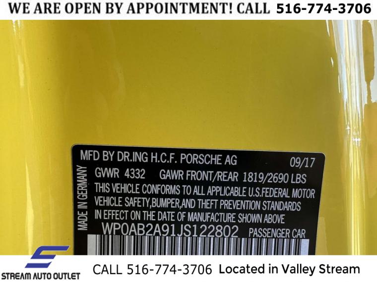 For more information on this 2018 Porsche 911, please call Stream Auto Outlet Valley Stream at (516) 774-3706 or with the contact form on this page. This vehicle's vin number is WP0AB2A91JS122802 and is recorded as being in stock at Stream Auto Outlet Valley Stream at 324 W Merrick Rd in Valley Stream. See all cars from this dealership.