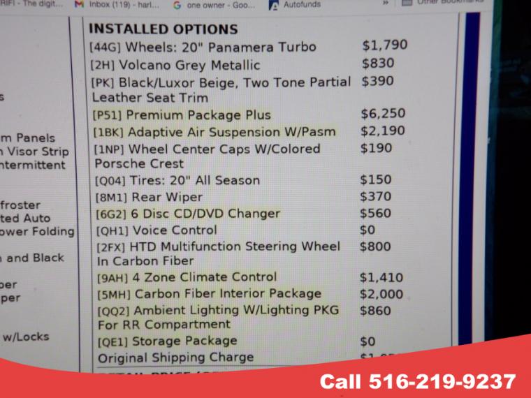 ABS, 4-Wheel Disc Brakes, 8-Speed A/T, A/C, A/T, Active Suspension, Adjustable Steering Wheel, Security System, Aluminum Wheels, AM/FM Stereo, Transmission w/Dual Shift Mode, Automatic Headlights, Auxiliary Audio Input, Back-Up Camera, Brake Assist, Bucket Seats, Cargo Shade, CD Player, Child Safety Locks, Climate Control, Cruise Control, Daytime Running Lights, Driver Air Bag, Driver Illuminated Vanity Mirror, Driver Vanity Mirror, Dual Moonroof, Multi-Zone A/C, Auto-Dimming Rearview Mirror, Stability Control, Floor Mats, Gasoline Fuel, Hard Disk Drive Media Storage, HD Radio, Headlights-Auto-Leveling, Heated Front Seat(s), Heated Mirrors, Intermittent Wipers, Keyless Entry, Keyless Start, Knee Air Bag, Leather Seats, Leather Steering Wheel, Mirror Memory, MP3 Player, Navigation System, Pass-Through Rear Seat, Passenger Air Bag, Passenger Air Bag Sensor, Passenger Illuminated Visor Mirror, Passenger Vanity Mirror, Power Door Locks, Power Mirror(s), Power Driver Seat, Power Folding Mirrors, Power Liftgate, Power Passenger Seat, Power Steering, Power Windows, Rear Bucket Seats, Rain Sensing Wipers, Rear Side Air Bag, Rear Defrost, Rear Head Air Bag, Rear Parking Aid, Rear Spoiler, Remote Trunk Release, Requires Subscription, Satellite Radio, Seat Memory, Front Side Air Bag, Front Head Air Bag, Smart Device Integration, Steering Wheel Audio Controls, Generic Sun/Moonroof, Tire Pressure Monitor, Tires - Front Performance, Tires - Rear Performance, Traction Control, Trip Computer, Turbocharged, Universal Garage Door Opener, V6 Cylinder Engine, Variable Speed Intermittent Wipers, Engine Immobilizer, Wheel Locks, WiFi Hotspot, Bluetooth Connection, Black Side Windows Trim and Black Front Windshield Trim, Body-Colored Front Bumper, Body-Colored Power Heated Auto Dimming Side Mirrors w/Power Folding, Body-Colored Rear Bumper, Chrome Door Handles, Clearcoat Paint, Express Open/Close Sliding And Tilting Glass 1st Row Sunroof w/Power Sunshade, Fixed Glass 2nd Row Sunroof w/Power Sunshade, Fixed Rear Window w/Defroster, Front Windshield -inc: Sun Visor Strip, Fully Automatic Projector Beam Led Low/High Beam Daytime Running Auto-Leveling Headlamps w/Delay-Off, Galvanized Steel/Aluminum Panels, LED Brakelights, Light Tinted Glass, Perimeter/Approach Lights, Power Liftgate Rear Cargo Access, Power Spoiler, Rain Detecting Variable Intermittent Wipers w/Heated Jets, Rear Fog Lamps, Spare Tire Mobility Kit, Tailgate/Rear Door Lock Included w/Power Door Locks, Tires: P265/45ZR19 Fr & P295/40ZR19 Rr, Wheels w/Silver Accents w/Locks, Wheels: 19" Panamera -inc: 9.0 x 19 front and 10.5 x 19 rear, dual-arm 5-spoke design, 2 12V DC Power Outlets, 2 Seatback Storage Pockets, 60-40 Folding Bucket Front Facing Fold Forward Seatback Rear Seat, 8-Way Power Seats -inc: front comfort seats w/8-way electric adjustment for seat height, seat angle, backrest angle and fore/aft position, Air Filtration, Bucket Front Seats, Cargo Features -inc: Spare Tire Mobility Kit, Carpet Floor Trim, Compass, Cruise Control, Day-Night Auto-Dimming Rearview Mirror, Delayed Accessory Power, Digital/Analog Display, Driver And Passenger Heated-Cushion, Driver And Passenger Heated-Seatback, Driver And Passenger Visor Vanity Mirrors w/Driver And Passenger Illumination, Driver Foot Rest, Driver Seat, Dual Zone Front Automatic Air Conditioning, Engine Immobilizer, Fade-To-Off Interior Lighting, Fixed Front Head Restraints and Fixed Rear Head Restraints, FOB Controls -inc: Trunk/Hatch/Tailgate, Front And Rear Map Lights, Front Center Armrest and Rear Center Armrest w/Storage, Front Cupholder, Full Carpet Floor Covering -inc: Carpet Front And Rear Floor Mats, Full Cloth Headliner, Full Floor Console w/Covered Storage, Mini Overhead Console, Rear Console w/Storage and 2 12V DC Power Outlets, Gauges -inc: Speedometer, Odometer, Tachometer, Trip Odometer and Trip Computer, HomeLink Garage Door Transmitter, HVAC -inc: Underseat Ducts, Residual Heat Recirculation, Headliner/Pillar Ducts and Console Ducts, Illuminated Locking Glove Box, Interior Trim -inc: Metal-Look/Piano Black Instrument Panel Insert, Metal-Look/Piano Black Door Panel Insert, Leather/Piano Black Console Insert and Metal-Look Interior Accents, Leather Door Trim Insert, Leather Steering Wheel, Leather/Metal-Look Gear Shift Knob, Manual Tilt/Telescoping Steering Column, Memory Settings -inc: Driver Seat and Door Mirrors, Outside Temp Gauge, Partial Leather Seat Trim, Passenger Seat, Perimeter Alarm, Power 1st Row Windows w/Front And Rear 1-Touch Up/Down, Power Door Locks w/Autolock Feature, Power Fuel Flap Locking Type, Power Rear Windows, Proximity Key For Push Button Start Only, Rear Cupholder, Refrigerated/Cooled Box Located In The Glovebox, Driver / Passenger And Rear Door Bins, Remote Keyless Entry w/Integrated Key Transmitter, Illuminated Entry, Illuminated Ignition Switch and Panic Button, Remote Releases -Inc: Power Cargo Access, Rigid Cargo Cover, Systems Monitor, Trip Computer, Trunk/Hatch Auto-Latch, Underhood And Cargo Space Lights, Valet Function, 23.7 Gal. Fuel Tank, 3.36 Axle Ratio, 4-Wheel Disc Brakes w/4-Wheel ABS, Front And Rear Vented Discs, Brake Assist, Hill Hold Control and Electric Parking Brake, Automatic w/Driver Control Ride Control Adaptive Suspension, Cell Phone Pre-Wiring, Double Wishbone Front Suspension w/Coil Springs, Dual Stainless Steel Exhaust w/Polished Tailpipe Finisher, Electric Power-Assist Steering, Engine Auto Stop-Start Feature, Engine Oil Cooler, Engine: 3.0L Turbocharged V6, Engine: 3.0L Turbocharged V6 -inc: aluminum block and cylinder heads, Front And Rear Anti-Roll Bars, Full-Time All-Wheel Drive, Gas-Pressurized Shock Absorbers, Multi-Link Rear Suspension w/Coil Springs, Rear-Wheel Drive, Regenerative Alternator, Towing Equipment -inc: Trailer Sway Control, Transmission w/Driver Selectable Mode, Sequential Shift Control w/Steering Wheel Controls and Oil Cooler, Transmission: 8-Speed Porsche Doppelkupplung (PDK), ABS And Driveline Traction C