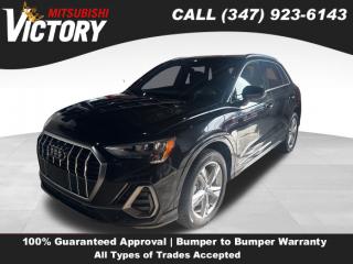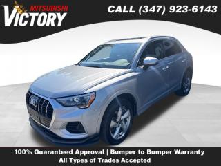 KBB.com 10 Best SUVs Worth Waiting For. Delivers 27 Highway MPG and 19 City MPG! This Audi Q3 delivers a Intercooled Turbo Regular Unleaded I-4 2.0 L/121 engine powering this Automatic transmission. Window Grid Diversity Antenna, Wheels: 18 x 7 5-Arm Design, Wheels w/Silver Accents.*This Audi Q3 Comes Equipped with These Options *Valet Function, Trunk/Hatch Auto-Latch, Trip Computer, Transmission: 8-Speed Tiptronic Automatic, Transmission w/Driver Selectable Mode, Tires: 235/55R18 All-Season, Tailgate/Rear Door Lock Included w/Power Door Locks, Strut Front Suspension w/Coil Springs, Streaming Audio, Steel Spare Wheel.*Stop By Today *Test drive this must-see, must-drive, must-own beauty today at Certified Luxury Motors of Great Neck, 105 Northern Blvd, Great Neck, NY 11021.Advertised price is the balance owed after a 25% down payment, and does not include tax, title, license inspection, finance charges, lender fees (if applicable) or dealer prep charges. To take advantage of advertised pricing, consumers must finance through the dealer. Not all will qualify for financing. Every reasonable effort has been made to ensure the accuracy of the information contained on this site, however absolute accuracy cannot be guaranteed. Please verify any information in question by calling the dealership directly. Advertised prices must be presented upon check-in at the dealership, or it will not be honored. Please confirm the accuracy of the specifications provided above with the dealer's representative. Neither the dealer nor the provider of the information is responsible for misprints or other errors regarding this data. Mileage information is based on an EPA rating at the time the vehicle was manufactured. Actual mileage will vary with options, driving conditions, driving habits, and vehicle's condition.