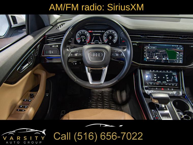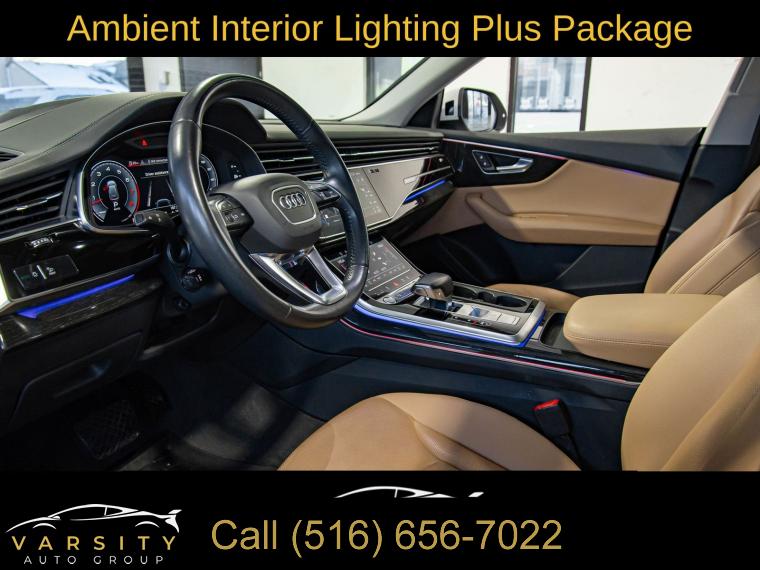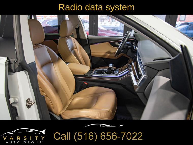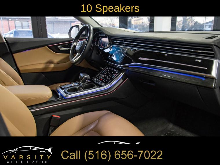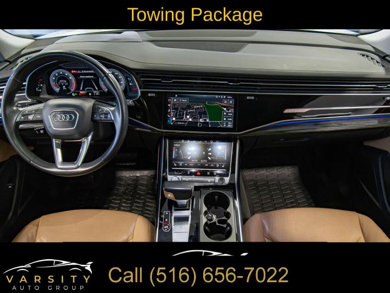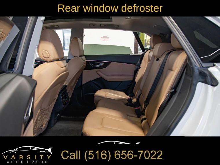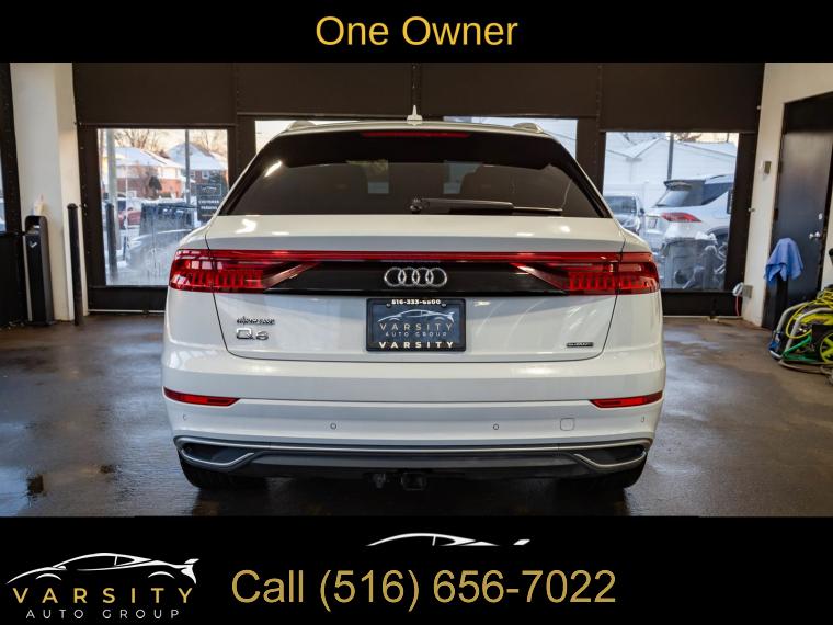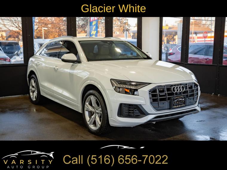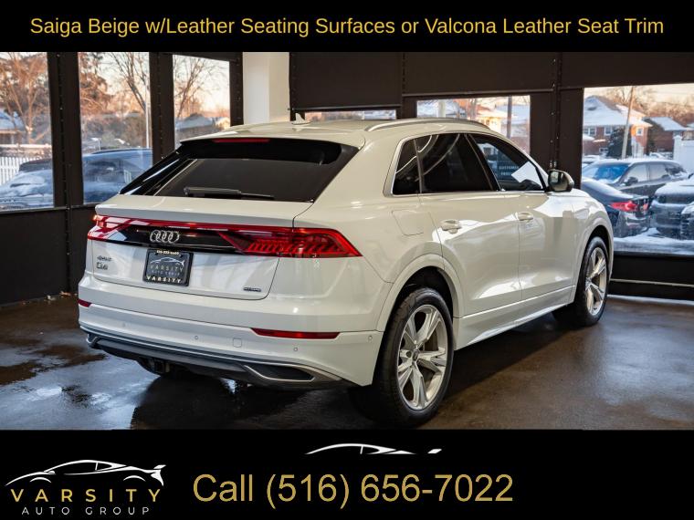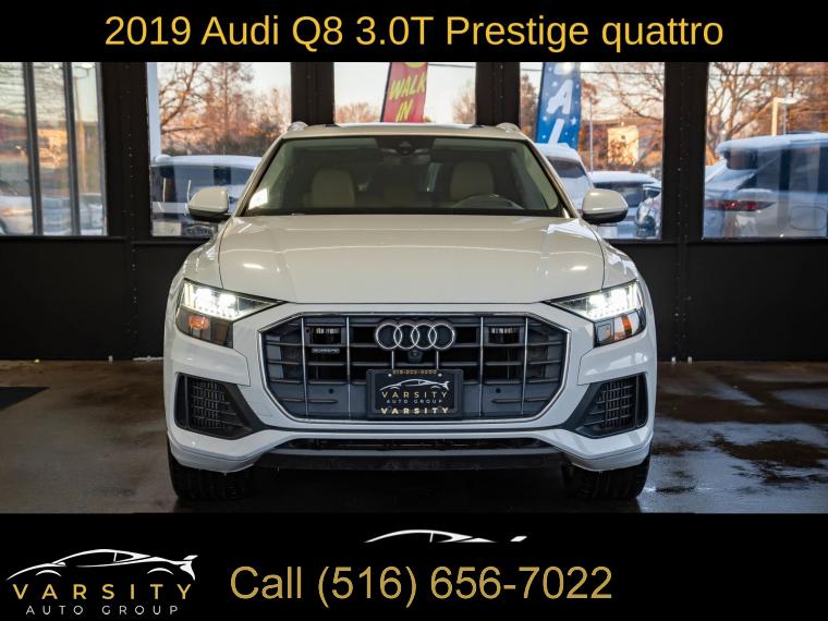2019 Audi Q8 3.0T Prestige quattro, Glacier White, Saiga Beige w/Leather Seating Surfaces or Valcona Leather Seat Trim, One Owner, 10 Speakers, 4-Wheel Disc Brakes, 4-Zone Climate Control, ABS brakes, Adaptive suspension, Air Conditioning, Alloy wheels, Alu Touch-Sensitive Interior Buttons, AM/FM radio: SiriusXM, Ambient Interior Lighting Plus Package, Audi Active Lane Departure Warning, Audi Adaptive Cruise Assist, Audi Guard Protection Kit, Audi Phone Box w/Wireless Charging, Audi Side Assist w/Pre Sense Rear, Audi smartphone interface (Apple CarPlay/Android Auto), Auto-dimming Rear-View mirror, Automatic temperature control, Axle Ratio: TBA, Bang & Olufsen 3D Premium Sound System, Brake assist, Bumpers: body-color, CD/DVD Player, Cold Weather Package, Compass, Convenience Package, Delay-off headlights, Driver Assistance Package, Driver door bin, Driver vanity mirror, Dual front impact airbags, Dual front side impact airbags, Electric Sunblinds for Rear Side Windows, Electronic Stability Control, Emergency communication system: Audi connect CARE, Exterior Parking Camera Rear, Four wheel independent suspension, Front & Rear Doors Audi Beam-Rings, Front anti-roll bar, Front Bucket Seats, Front Center Armrest, Front dual zone A/C, Front fog lights, Front reading lights, Fully automatic headlights, Garage door transmitter: HomeLink, Genuine wood door panel insert, HD Matrix Design LED Headlights, Headlight Washer System, Heads-Up Display, Heated door mirrors, Heated Front Bucket Seats, Heated front seats, Heated Power Folding Auto-Dimming Exterior Mirrors, Heated Rear Seats, Heated Steering Wheel, High-Beam Assist, High-Gloss Gray Oak Wood Inlays, Illuminated Door Sills, Illuminated entry, Leather Dashboard, Leather Seating Surfaces, Leather Shift Knob, Leather steering wheel, Low tire pressure warning, Memory seat, Navigation System, Occupant sensing airbag, Outside temperature display, Overhead airbag, Overhead console, Panic alarm, Passenger door bin, Passenger vanity mirror, Power Door Closers, Power door mirrors, Power driver seat, Power Liftgate, Power moonroof, Power passenger seat, Power steering, Power windows, Prestige, Radio data system, Radio: Audi MMI Navigation Plus w/Touch Response, Rain sensing wipers, Rear air conditioning, Rear anti-roll bar, Rear fog lights, Rear reading lights, Rear seat center armrest, Rear window defroster, Rear window wiper, Remote keyless entry, Roof rack: rails only, Security system, Speed control, Speed-sensing steering, Split folding rear seat, Spoiler, Steering wheel memory, Steering wheel mounted audio controls, Tachometer, Telescoping steering wheel, Tilt steering wheel, Top View Camera System, Towing 7 Pin Connector, Towing Package, Traction control, Traffic Sign Recognition, Trip computer, Turn signal indicator mirrors, USB Cables, Variably intermittent wipers, Ventilated Front Seats, Wheels: 20" 5-Spoke, Wheels: 21" 5-Spoke W-Design. Glacier White 2019 Audi Q8 3.0T Prestige quattro quattro 8-Speed Automatic with Tiptronic 3.0L V6 Turbocharged DOHC 24V LEV3-ULEV125 335hp