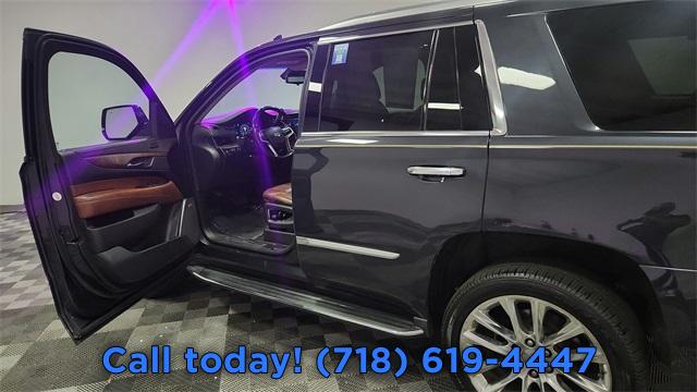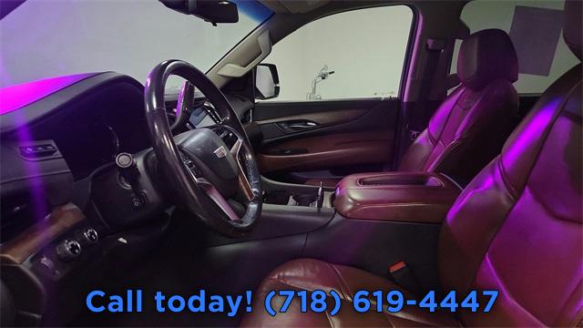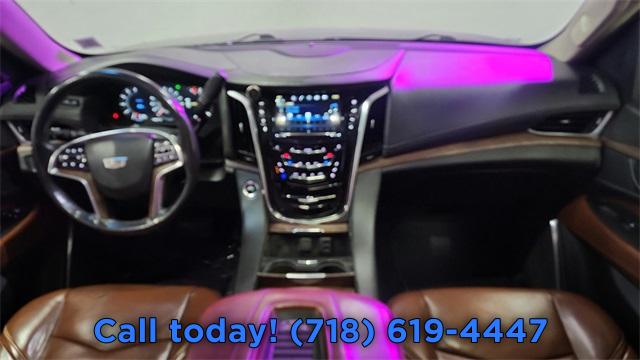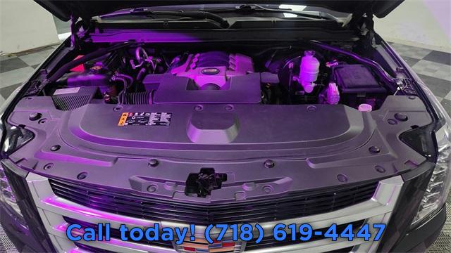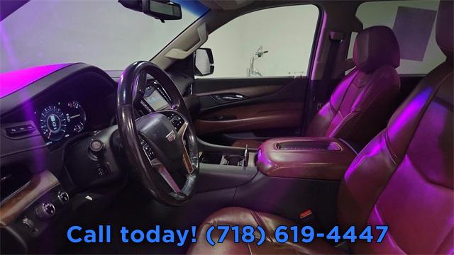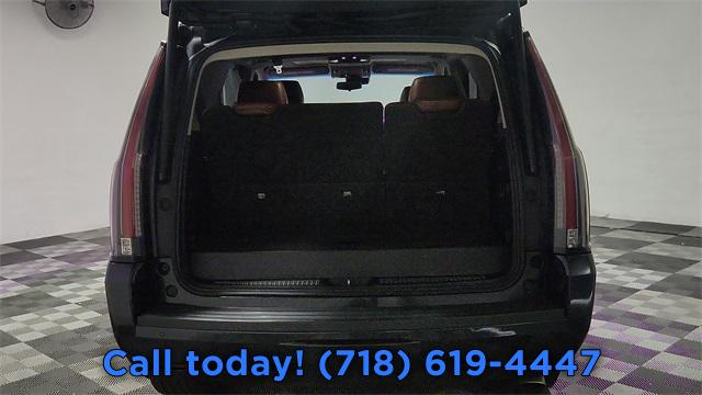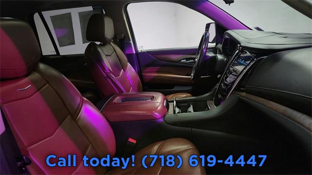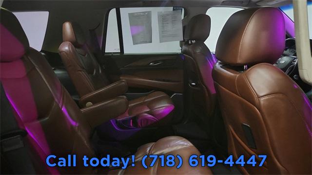 Navigation System, Driver Awareness Package, Interior Protection Package (LPO), Preferred Equipment Group 1SB, Theft-Deterrent Package, 16 Speakers, AM/FM radio: SiriusXM, Bose Centerpoint 16 Speaker Surround Sound System, CD player, DVD-Audio, HD Radio, Radio data system, Radio: AM/FM Cadillac User Experience w/Nav, Rear audio controls, Single Slot CD/MP3 Player, SiriusXM Radio, Air Conditioning, Automatic temperature control, Front dual zone A/C, Rear air conditioning, Rear window defroster, 12-Way Power Front Passenger Seat Adjuster, Heads-Up Display, Memory seat, Pedal memory, Power driver seat, Power steering, Power windows, Reconfigurable 4-Color Head-Up Display, Remote keyless entry, Steering wheel memory, Steering wheel mounted audio controls, Adaptive suspension, Auto-leveling suspension, Magnetic Ride Control Suspension, Traction control, 4-Wheel Disc Brakes, ABS brakes, Dual front impact airbags, Dual front side impact airbags, Emergency communication system: OnStar Protection, Front anti-roll bar, Front wheel independent suspension, Low tire pressure warning, Occupant sensing airbag, Overhead airbag, Rear anti-roll bar, Power moonroof, Power Tilt-Sliding Sunroof w/Express-Open/Close, Rear Seat Entertainment System, Power Liftgate, Brake assist, Electronic Stability Control, Exterior Parking Camera Rear, Auto High-beam Headlights, Delay-off headlights, Fully automatic headlights, Panic alarm, Safety Alert Seat, Security system, Theft-Deterrent Alarm System, Speed control, Auto-dimming door mirrors, Black Front License Plate Bracket, Bodyside moldings, Bumpers: body-color, Heated door mirrors, IntelliBeam Automatic High Beam On/Off, Polished Exhaust Tip, Power door mirrors, Rear Camera Mirror Washer, Roof rack: rails only, Spoiler, Turn signal indicator mirrors, 1st 2nd & 3rd Row All-Weather Floor Mats (LPO), Adjustable pedals, All-Weather Cargo Mat (LPO), Apple CarPlay/Android Auto, Auto tilt-away steering wheel, Compass, Driver door bin, Driver vanity mirror, Forward Collision Alert, Front reading lights, Garage door transmitter, Heated steering wheel, Illuminated entry, Inclination Sensor, Lane Change Alert w/Side Blind Zone Alert, Lane Keep Assist w/Lane Departure Warning, Leather Shift Knob, Leather steering wheel, Low Speed Forward Automatic Braking, Outside temperature display, Overhead console, Passenger vanity mirror, Rear Camera Mirror, Rear Cross Traffic Alert, Rear reading lights, SiriusXM NavTraffic, Tachometer, Telescoping steering wheel, Tilt steering wheel, Trip computer, Vehicle Interior Movement Sensor, 2-Presets Memory For Driver Seat Adjuster, 3rd row seats: split-bench, Front Bucket Seats, Heated & Cooled Driver & Front Passenger Seats, Heated front seats, Heated rear seats, Leather Seating Surfaces, Power Configurable Second Row Bucket Seats, Power passenger seat, Split folding rear seat, Ventilated front seats, Front Center Armrest w/Storage, Passenger door bin, Alloy wheels, Wheel Locks, Wheels: 22" x 9" 12-Spoke Polished Finish Alloy, Wheels: 22" x 9" 7-Spoke Alloy w/Chrome Inserts, Rain sensing wipers, Rear window wiper, Variably intermittent wipers, 3.23 Axle Ratio