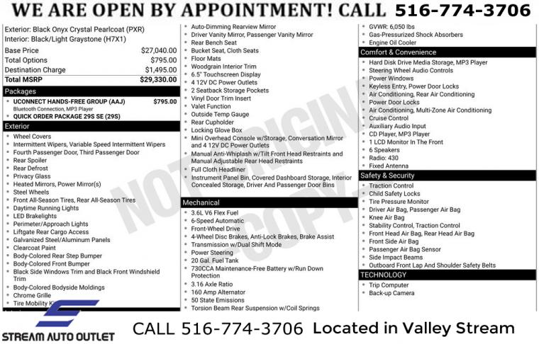 Quick Order Package 29S SE, Uconnect Hands-Free Group, Uconnect Hands-Free Group w/AT4, 40GB Hard Drive w/28GB Available, 6 Speakers, AM/FM radio, Audio Jack Input for Mobile Devices, Bluetooth® Streaming Audio, CD player, Radio: 430, Air Conditioning, Front dual zone A/C, Rear air conditioning, Rear Air Conditioning w/Heater, Rear window defroster, Power steering, Power windows, Remote keyless entry, Steering wheel mounted audio controls, Traction control, 4-Wheel Disc Brakes, ABS brakes, Anti-whiplash front head restraints, Dual front impact airbags, Dual front side impact airbags, Front anti-roll bar, Front wheel independent suspension, Knee airbag, Low tire pressure warning, Occupant sensing airbag, Overhead airbag, Brake assist, Electronic Stability Control, ParkView Rear Back-Up Camera, Delay-off headlights, Panic alarm, Speed control, Black Door Handles, Bodyside moldings, Bumpers: body-color, Heated door mirrors, Power door mirrors, Spoiler, Touring Suspension, 6.5" Touchscreen Display, Auto-dimming Rear-View mirror, Driver door bin, Driver vanity mirror, Front reading lights, Illuminated entry, Outside temperature display, Overhead console, Passenger seat mounted armrest, Passenger vanity mirror, Remote USB Port, Steering Wheel Mounted Audio Controls, Tachometer, Telescoping steering wheel, Tilt steering wheel, Trip computer, Uconnect Voice Command w/Bluetooth, 2nd Row Bench w/Rear Stow 'N Go 60/40, 3rd row seats: split-bench, Cloth Low-Back Bucket Seats, Driver's Seat Mounted Armrest, Front Bucket Seats, Reclining 3rd row seat, Passenger door bin, 17" Wheel Covers, 17" x 6.5" Steel Wheels, Rear window wiper, Variably intermittent wipers, 3.16 Axle Ratio, * NYS INSPECTION INCLUDED *, * FULL INTERIOR / EXTERIOR DETAIL *, * BLUETOOTH *, * LIMITED NYS LEMON LAW WARRANTY INCLUDED *, *FRESH OIL CHANGE *, * 150 MULTI POINT INSPECTION *