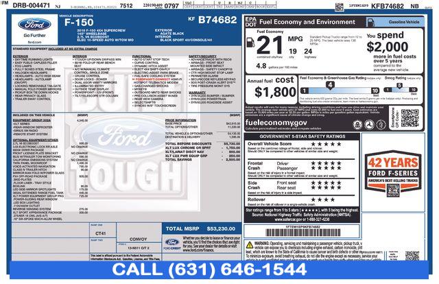 Equipment Group 302A Luxury, FX4 Off-Road Package, GVWR: 6, 500 lbs Payload Package, GVWR: 6, 600 lbs Payload Package, XLT Chrome Appearance Package, XLT Power Equipment Group, XLT Sport Appearance Package, 6 Speakers, AM/FM radio, Radio data system, Radio: AM/FM Stereo w/6 Speakers, SiriusXM Radio, Air Conditioning, Rear Window Defroster, Power steering, Power windows, Power-Adjustable Pedals, Remote keyless entry, Steering wheel mounted audio controls, Off-Road Tuned Front Shock Absorbers, Speed-sensing steering, Traction control, 4-Wheel Disc Brakes, ABS brakes, Body-Color Front & Rear Bumpers, Dual front impact airbags, Dual front side impact airbags, Emergency communication system: SYNC 3 911 Assist, Front anti-roll bar, Front wheel independent suspension, Low tire pressure warning, Occupant sensing airbag, Overhead airbag, Remote Start System, Twin Panel Moonroof, BLIS Blind Spot Information System, Brake assist, Electronic Stability Control, Exterior Parking Camera Rear, Hill Descent Control, Auto High-beam Headlights, Delay-off headlights, Front fog lights, Fully automatic headlights, Panic alarm, Security system, Speed control, 2-Bar Style Grille w/2 Minor Bars Painted Dark, 2-Bar Style Grille w/Chrome 2 Minor Bars, 4x4 FX4 Off-Road Bodyside Decal, Accent-Color Step Bars, Body-Color Door & Tailgate Handles, Box Side Decals, BoxLink, Bumpers: chrome, Chrome Door & Tailgate Handles w/Body-Color Bezel, Chrome Step Bars, Front License Plate Bracket, LED Box Lighting, LED Sideview Mirror Spotlights, Power door mirrors, Power Glass Heated Sideview Mirrors, Rear step bumper, Single-Tip Chrome Exhaust, 110V/400W Outlet, 4.2" Productivity Screen in Instrument Cluster, AppLink/Apple CarPlay and Android Auto, Auto-Dimming Rear-View Mirror, Compass, Driver door bin, Driver vanity mirror, Illuminated entry, Leather-Wrapped Steering Wheel, Outside temperature display, Passenger vanity mirror, Reverse Sensing System, SYNC 3, Tachometer, Telescoping steering wheel, Tilt steering wheel, Tray Style Floor Liner, Voice-Activated Touchscreen Navigation, Voltmeter, 8-Way Power Driver Seat, Cloth 40/20/40 Front Seat, Heated Front Seats, Rear Under-Seat Storage, Split folding rear seat, Extended Range 36 Gallon Fuel Tank, Front Center Armrest w/Storage, Passenger door bin, Class IV Trailer Hitch Receiver, Alloy wheels, Wheels: 17" Silver Painted Aluminum, Wheels: 18" 6-Spoke Machined-Aluminum, Wheels: 18" Chrome-Like PVD, Fixed Backlight w/Privacy Glass, Power-Sliding Rear Window, Variably intermittent wipers