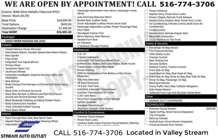 Quick Order Package 26G, 10 Speakers, 9 Amplified Speakers w/Subwoofer (DISC), AM/FM radio: SiriusXM, Audio memory, GPS Antenna Input, Integrated Voice Command w/Bluetooth, Radio data system, Radio: Uconnect 4 w/8.4" Display, SiriusXM Satellite Radio, Air Conditioning, Automatic temperature control, Auxiliary Transmission Oil Cooler, Front dual zone A/C, Rear window defroster, Memory seat, Power driver seat, Power steering, Power windows, Remote keyless entry, Steering wheel mounted audio controls, Four wheel independent suspension, Normal Duty Suspension, Speed-sensing steering, Traction control, 4-Wheel Disc Brakes, ABS brakes, Anti-whiplash front head restraints, Dual front impact airbags, Dual front side impact airbags, Front anti-roll bar, Knee airbag, Low tire pressure warning, Occupant sensing airbag, Overhead airbag, Rear anti-roll bar, Rear side impact airbag, Power Liftgate, Brake assist, Electronic Stability Control, ParkView Rear Back-Up Camera, Delay-off headlights, Front fog lights, Fully automatic headlights, Dual Bright Exhaust Tips, Panic alarm, Security system, Speed control, Engine Oil Cooler, Stop-Start Multiple VSM System, AutoStick Automatic Transmission, Bumpers: body-color, Exterior Mirrors Courtesy Lamps, Exterior Mirrors w/Supplemental Signals, Heated door mirrors, Power door mirrors, Roof rack: rails only, Spoiler, Turn signal indicator mirrors, 8.4" Touchscreen Display, Apple CarPlay, Apple CarPlay/Android Auto, Auto-dimming Rear-View mirror, Compass, Driver door bin, Driver vanity mirror, Front reading lights, Garage door transmitter, Glove Box Lamp, Google Android Auto, Heated steering wheel, Illuminated entry, Leather Shift Knob, Outside temperature display, Overhead console, Passenger vanity mirror, Rear reading lights, Rear seat center armrest, Tachometer, Telescoping steering wheel, Tilt steering wheel, Trip computer, USB Host Flip, Voltmeter, Front Bucket Seats, Front Center Armrest, Heated front seats, Power passenger seat, Premium Leather Trimmed Bucket Seats, Split folding rear seat, Glove Box w/Damped Door (DISC), Passenger door bin, Alloy wheels, Wheels: 18" x 7" Polished/Painted Aluminum, Rear window wiper, Variably intermittent wipers, 3.251 Axle Ratio, * NYS INSPECTION INCLUDED *, * FULL INTERIOR / EXTERIOR DETAIL *, * BLUETOOTH *, * LIMITED NYS LEMON LAW WARRANTY INCLUDED *, *FRESH OIL CHANGE *, * 150 MULTI POINT INSPECTION *