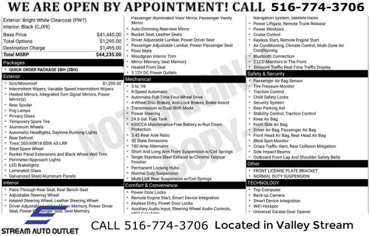 Navigation System, Quick Order Package 2BH, 6 Speakers, AM/FM radio: SiriusXM, Audio memory, Radio data system, Radio: Uconnect 4C Nav w/8.4" Display, Air Conditioning, Automatic temperature control, Front dual zone A/C, Rear window defroster, Memory seat, Power driver seat, Power steering, Power windows, Remote keyless entry, Steering wheel mounted audio controls, Four wheel independent suspension, Normal Duty Suspension, Speed-sensing steering, Traction control, 4-Wheel Disc Brakes, ABS brakes, Anti-whiplash front head restraints, Dual front impact airbags, Dual front side impact airbags, Emergency communication system: SiriusXM Guardian, Front anti-roll bar, Knee airbag, Low tire pressure warning, Occupant sensing airbag, Overhead airbag, Rear anti-roll bar, Power Sunroof, Power Liftgate, Brake assist, Electronic Stability Control, ParkView Rear Back-Up Camera, Delay-off headlights, Front fog lights, Fully automatic headlights, Panic alarm, Security system, Speed control, Auto-dimming door mirrors, Bumpers: body-color, Chrome Exterior Mirrors, Front License Plate Bracket, Heated door mirrors, Power door mirrors, Roof rack: rails only, Spoiler, Turn signal indicator mirrors, 8.4" Touchscreen Display, Apple CarPlay/Android Auto, Auto-dimming Rear-View mirror, Compass, Driver door bin, Driver vanity mirror, Front reading lights, Garage door transmitter, Heated steering wheel, Illuminated entry, Leather Shift Knob, Outside temperature display, Overhead console, Passenger vanity mirror, Rear reading lights, Rear seat center armrest, Tachometer, Telescoping steering wheel, Tilt steering wheel, Trip computer, Voltmeter, Front Bucket Seats, Heated front seats, Leather Trimmed Bucket Seats, Power passenger seat, Split folding rear seat, Front Center Armrest w/Storage, Passenger door bin, Alloy wheels, Wheels: 18" x 8.0" Tech Gray Aluminum, Rear window wiper, Speed-Sensitive Wipers, Variably intermittent wipers, 3.45 Rear Axle Ratio, * NYS INSPECTION INCLUDED *, * FULL INTERIOR / EXTERIOR DETAIL *, * BLUETOOTH *, * SUNROOF / MOONROOF*, * LEATHER SEATS *, * LIMITED NYS LEMON LAW WARRANTY INCLUDED *, *FRESH OIL CHANGE *, * 150 MULTI POINT INSPECTION *, APPLE CAR PLAY/ANDROID AUTO