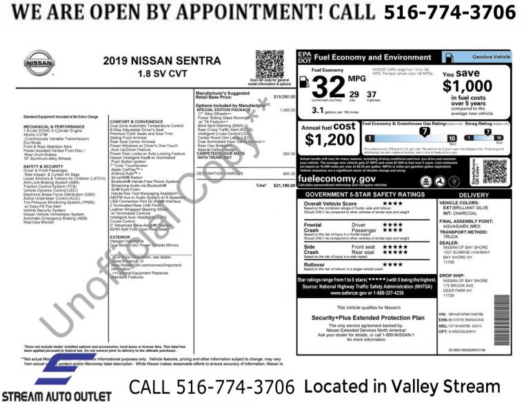 For more information on this 2019 Nissan Sentra, please call Stream Auto Outlet Valley Stream at (516) 774-3706 or with the contact form on this page. This vehicle's vin number is 3N1AB7AP9KY343789 and is recorded as being in stock at Stream Auto Outlet Valley Stream at 324 W Merrick Rd in Valley Stream. See all cars from this dealership.