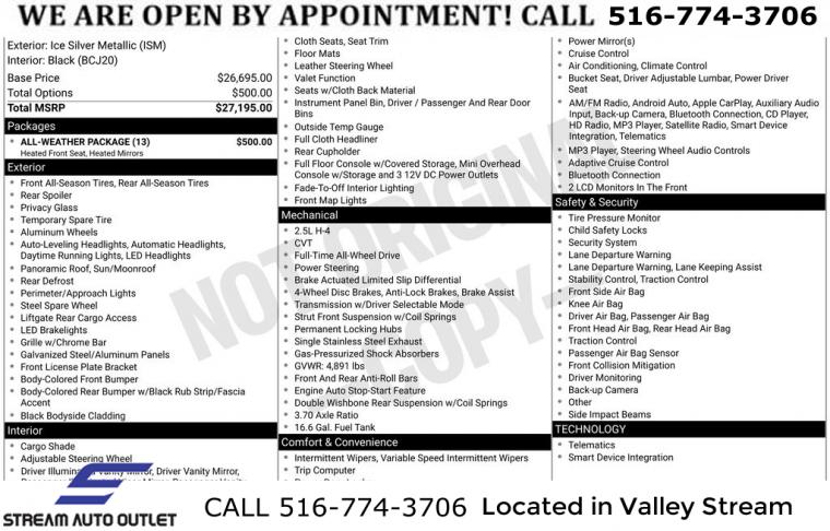 All-Weather Package, 6 Speakers, AM/FM radio: SiriusXM, CD player, Radio data system, Radio: Subaru Starlink 6.5" Multimedia Plus System, Air Conditioning, Automatic temperature control, Rear window defroster, Power driver seat, Power steering, Power windows, Remote keyless entry, Steering wheel mounted audio controls, Four wheel independent suspension, Speed-sensing steering, Traction control, 4-Wheel Disc Brakes, ABS brakes, Dual front impact airbags, Dual front side impact airbags, Emergency communication system: STARLINK Safety and Security, Front anti-roll bar, Knee airbag, Low tire pressure warning, Occupant sensing airbag, Overhead airbag, Rear anti-roll bar, Power moonroof: Panoramic, Brake assist, Electronic Stability Control, Exterior Parking Camera Rear, Fully automatic headlights, Panic alarm, Security system, Speed control, Bumpers: body-color, Heated Exterior Mirrors, Power door mirrors, Roof rack: rails only, Spoiler, Driver door bin, Driver vanity mirror, Front reading lights, Illuminated entry, Outside temperature display, Overhead console, Passenger vanity mirror, Rear seat center armrest, STARLINK/Apple CarPlay/Android Auto, Tachometer, Telescoping steering wheel, Tilt steering wheel, Trip computer, Cloth Upholstery, Front Bucket Seats, Front Center Armrest, Heated Front Seats, Split folding rear seat, Passenger door bin, Alloy wheels, Wheels: 17" x 7.0J Black Machine Finish Alloy, Rear window wiper, Variably intermittent wipers, Windshield Wiper De-Icer, 3.70 Axle Ratio, * NYS INSPECTION INCLUDED *, * FULL INTERIOR / EXTERIOR DETAIL *, * BLUETOOTH *, * LIMITED NYS LEMON LAW WARRANTY INCLUDED *, *FRESH OIL CHANGE *, * 150 MULTI POINT INSPECTION *
