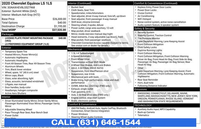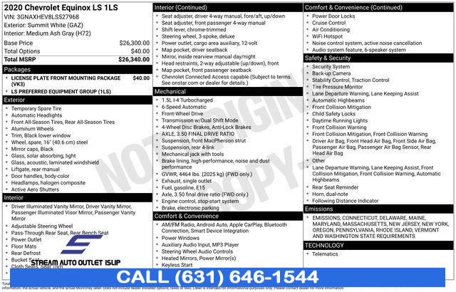 For more information on this 2020 Chevrolet Equinox, please call Stream Auto Outlet Islip at (631) 646-1544 or with the contact form on this page. This vehicle's vin number is 3GNAXHEV8LS527968 and is recorded as being in stock at Stream Auto Outlet Islip at 2232 Sunrise Hwy in Islip. See all cars from this dealership.