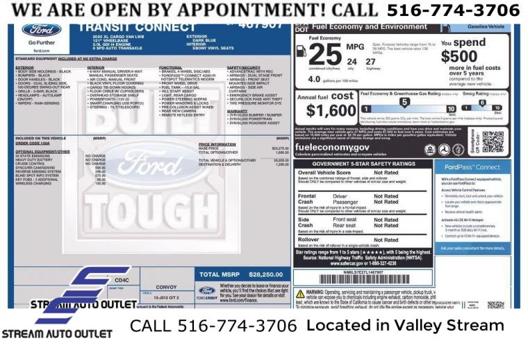 For more information on this 2020 Ford Transit Connect, please call Stream Auto Outlet Valley Stream at (516) 774-3706 or with the contact form on this page. This vehicle's vin number is NM0LS7E27L1467907 and is recorded as being in stock at Stream Auto Outlet Valley Stream at 324 W Merrick Rd in Valley Stream. See all cars from this dealership.
