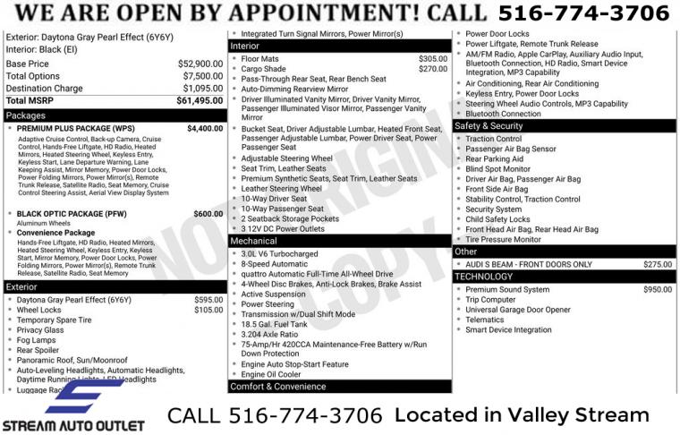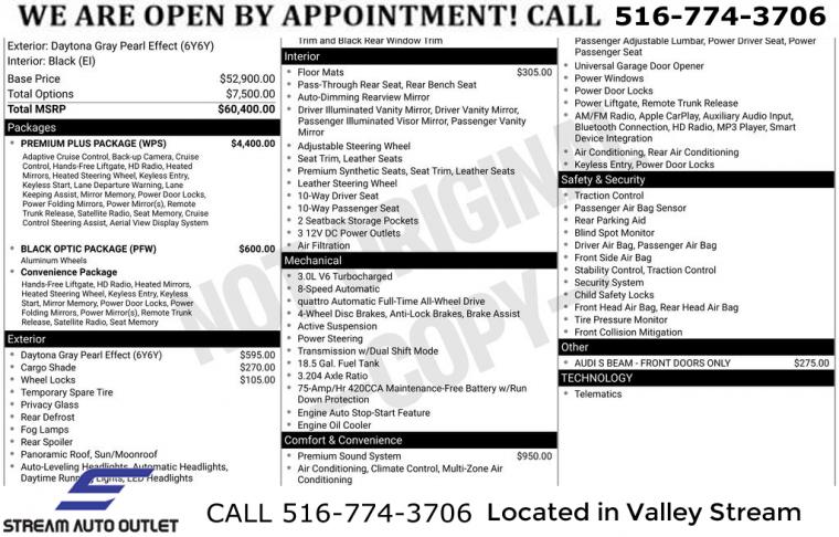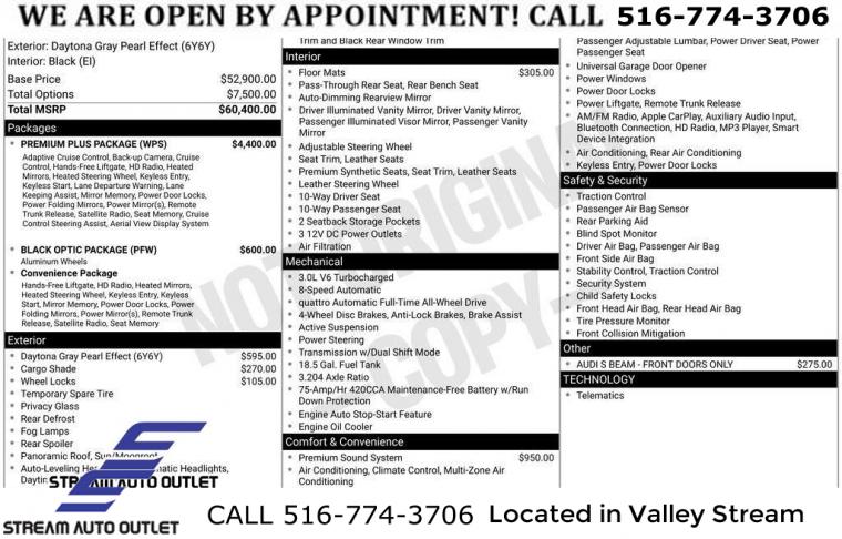 * NYS INSPECTION INCLUDED *, * FULL INTERIOR / EXTERIOR DETAIL *, * BLUETOOTH *, * LIMITED NYS LEMON LAW WARRANTY INCLUDED *, *FRESH OIL CHANGE *, * 150 MULTI POINT INSPECTION *, Adaptive Cruise Control w/Traffic Jam Assist, Audi Active Lane Assist, Audi Advanced Key, Audi Phone Box, Audi Virtual Cockpit, Black Optic Package, Convenience Package, Driver Seat Memory, Hands-On Detection Steering Wheel, Heated Auto-Dimming Power Folding Exterior Mirrors, Heated Steering Wheel, High-Gloss Black Exterior Mirror Housings, High-gloss Black Exterior Trim, Leatherette Covered Center Console, Matte Black Roof Rails, Panoramic Sunroof, Premium Plus Package, SiriusXM All Access Service, Top View Camera System, Wheels: 20" 5-V Spoke-Star Design.