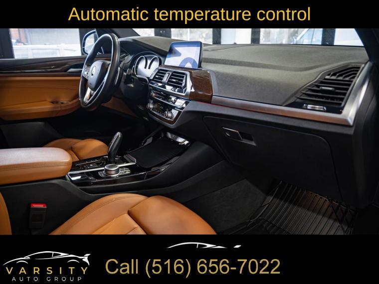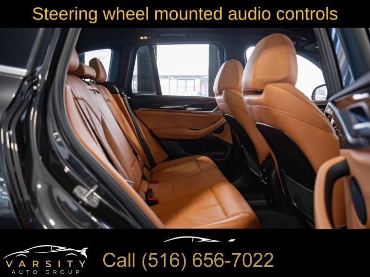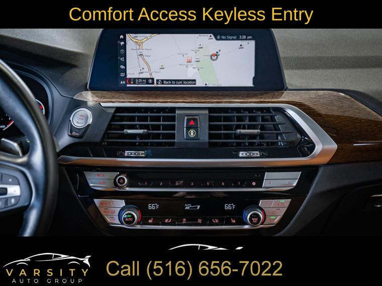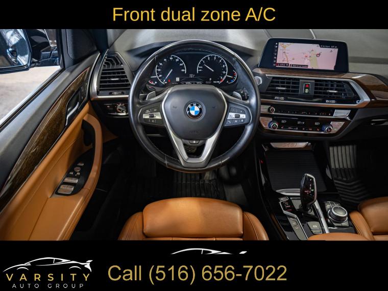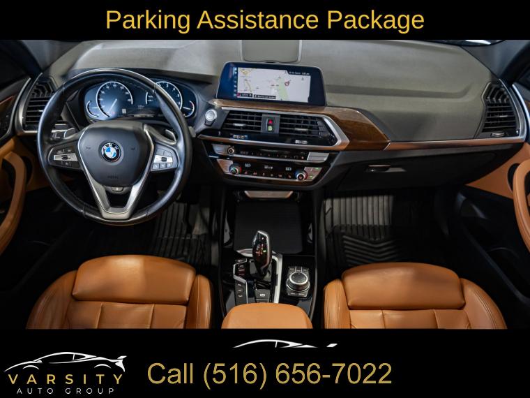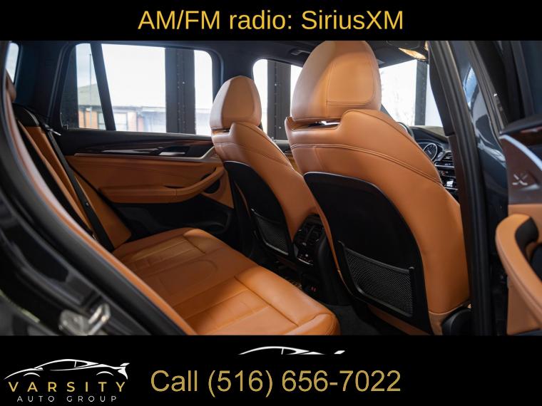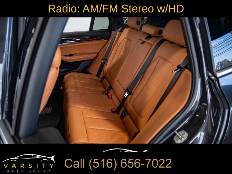 Navigation, Navigation System, Connected Package Plus, Convenience Package, Parking Assistance Package, 12 Speakers, AM/FM radio: SiriusXM, Hi-Fi Sound System, Radio Control US, Radio data system, Radio: AM/FM Stereo w/HD, SiriusXM Satellite Radio, Air Conditioning, Automatic temperature control, Front dual zone A/C, Rear air conditioning, Rear window defroster, Comfort Access Keyless Entry, Lumbar Support, Memory seat, Power driver seat, Power steering, Power windows, Remote keyless entry, Steering wheel mounted audio controls, Four wheel independent suspension, Speed-sensing steering, Traction control, 4-Wheel Disc Brakes, ABS brakes, Dual front impact airbags, Dual front side impact airbags, Emergency communication system: BMW Assist eCall, Front anti-roll bar, Knee airbag, Low tire pressure warning, Occupant sensing airbag, Overhead airbag, Rear anti-roll bar, Panoramic Moonroof, Power Liftgate, Brake assist, Electronic Stability Control, Exterior Parking Camera Rear, Rear-View Camera, Delay-off headlights, Front fog lights, Fully automatic headlights, Panic alarm, Security system, Speed control, Auto-dimming door mirrors, Bumpers: body-color, Heated door mirrors, Parking Assistant Plus, Power door mirrors, Roof rack: rails only, Spoiler, Turn signal indicator mirrors, Active Park Distance Control, Ambient Lighting, Apple CarPlay Compatibility, Auto-dimming Rear-View mirror, BMW Assist eCall, BMW TeleServices, ConnectedDrive Services, Driver door bin, Driver vanity mirror, Front reading lights, Garage door transmitter, Genuine wood dashboard insert, Genuine wood door panel insert, Heated Steering Wheel, Illuminated entry, Outside temperature display, Passenger vanity mirror, Rear reading lights, Rear seat center armrest, Sport steering wheel, Surround View w/3D View, Tachometer, Telescoping steering wheel, Tilt steering wheel, Trip computer, WiFi Hotspot, Front Bucket Seats, Front Center Armrest, Heated Front Seats, Power Front Seats, Power passenger seat, SensaTec Upholstery, Split folding rear seat, Sport Bucket Seats, Passenger door bin, Alloy wheels, Wheels: 18" x 7.0" Y-Spoke (Style 688), Rain sensing wipers, Rear window wiper, Speed-Sensitive Wipers, Variably intermittent wipers, 3.385 Axle Ratio, 2021 BMW X3 xDrive30i, Dark Graphite Metallic