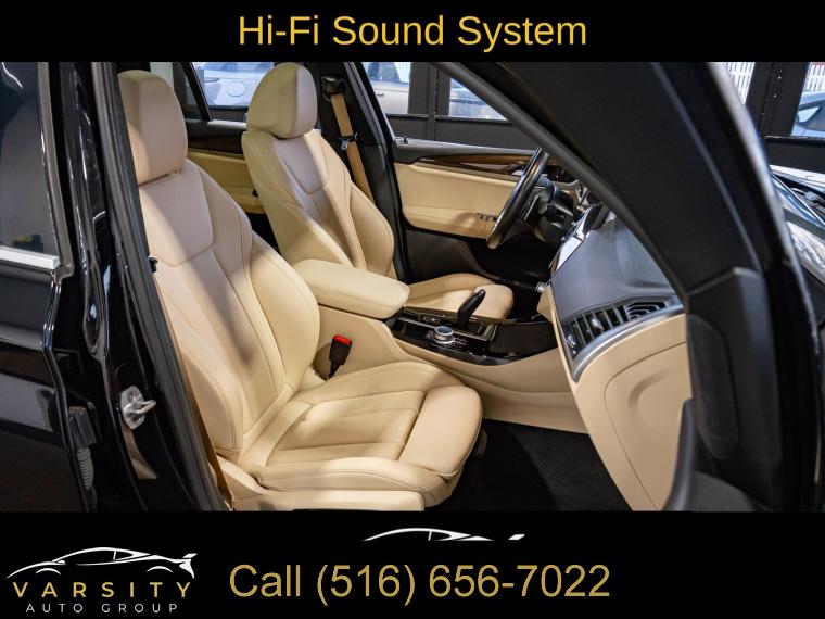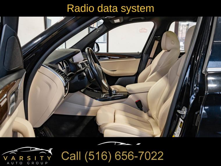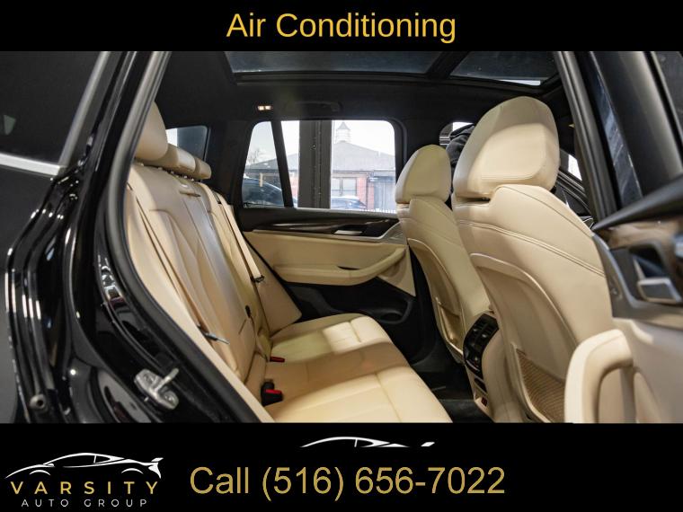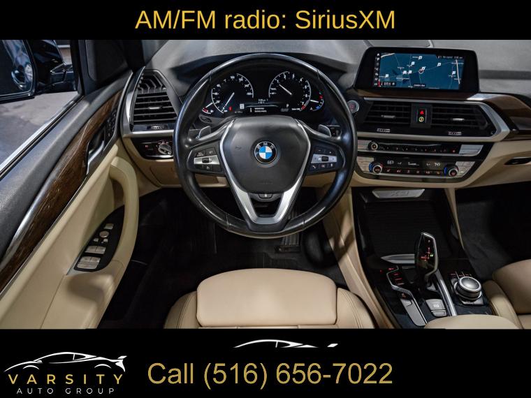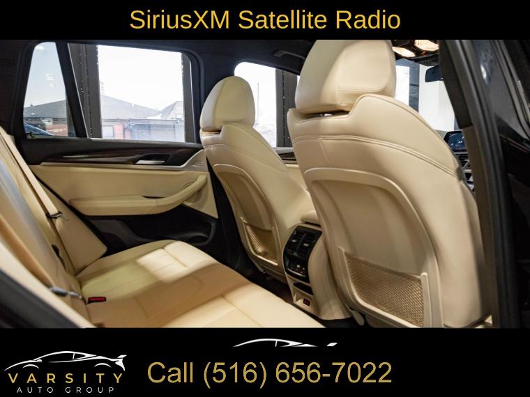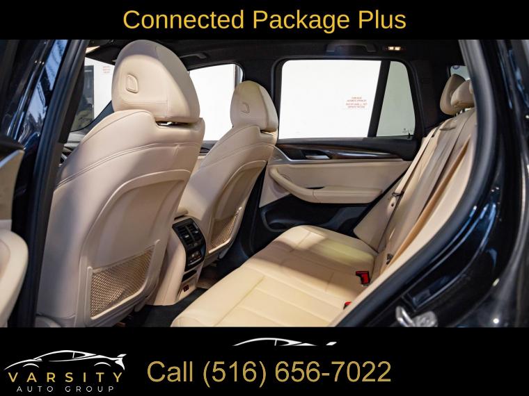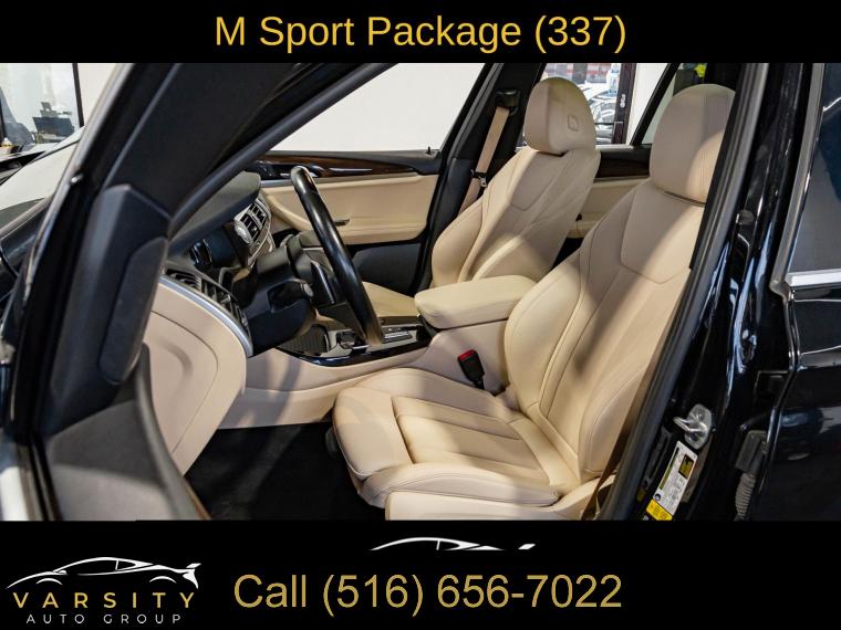 Navigation, Navigation System, Connected Package Plus, Convenience Package, M Sport Package (337), 12 Speakers, AM/FM radio: SiriusXM, Hi-Fi Sound System, Radio Control US, Radio data system, Radio: AM/FM Stereo w/HD, SiriusXM Satellite Radio, Air Conditioning, Automatic temperature control, Front dual zone A/C, Rear air conditioning, Rear window defroster, Comfort Access Keyless Entry, Lumbar Support, Memory seat, Power driver seat, Power steering, Power windows, Remote keyless entry, Steering wheel mounted audio controls, Four wheel independent suspension, Speed-sensing steering, Traction control, 4-Wheel Disc Brakes, ABS brakes, Dual front impact airbags, Dual front side impact airbags, Emergency communication system: BMW Assist eCall, Front anti-roll bar, Knee airbag, Low tire pressure warning, Occupant sensing airbag, Overhead airbag, Rear anti-roll bar, Panoramic Moonroof, Power Liftgate, Brake assist, Electronic Stability Control, Exterior Parking Camera Rear, Delay-off headlights, Front fog lights, Fully automatic headlights, Panic alarm, Security system, Speed control, Auto-dimming door mirrors, Bumpers: body-color, Heated door mirrors, Power door mirrors, Roof rack: rails only, Spoiler, Turn signal indicator mirrors, Apple CarPlay Compatibility, Auto-dimming Rear-View mirror, BMW Assist eCall, BMW TeleServices, ConnectedDrive Services, Driver door bin, Driver vanity mirror, Front reading lights, Garage door transmitter, Genuine wood dashboard insert, Genuine wood door panel insert, Heated Steering Wheel, Illuminated entry, Outside temperature display, Passenger vanity mirror, Rear reading lights, Rear seat center armrest, Sport steering wheel, Tachometer, Telescoping steering wheel, Tilt steering wheel, Trip computer, WiFi Hotspot, Front Bucket Seats, Front Center Armrest, Heated Front Seats, Power Front Seats, Power passenger seat, SensaTec Upholstery, Split folding rear seat, Sport Bucket Seats, Passenger door bin, Alloy wheels, Wheels: 18" x 7.0" Y-Spoke (Style 688), Wheels: 19" x 7.5" Y-Spoke (Style 693), Rain sensing wipers, Rear window wiper, Speed-Sensitive Wipers, Variably intermittent wipers, 3.385 Axle Ratio, 2021 BMW X3 xDrive30i, Jet Black, Canberra Beige/Black w/SensaTec Upholstery, Panoramic Moonroof.