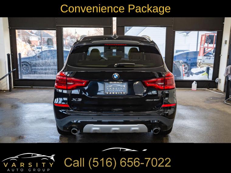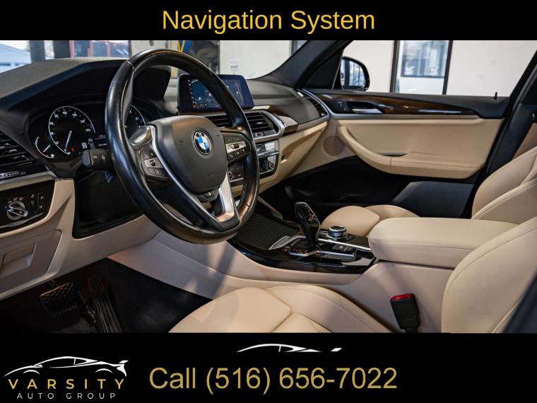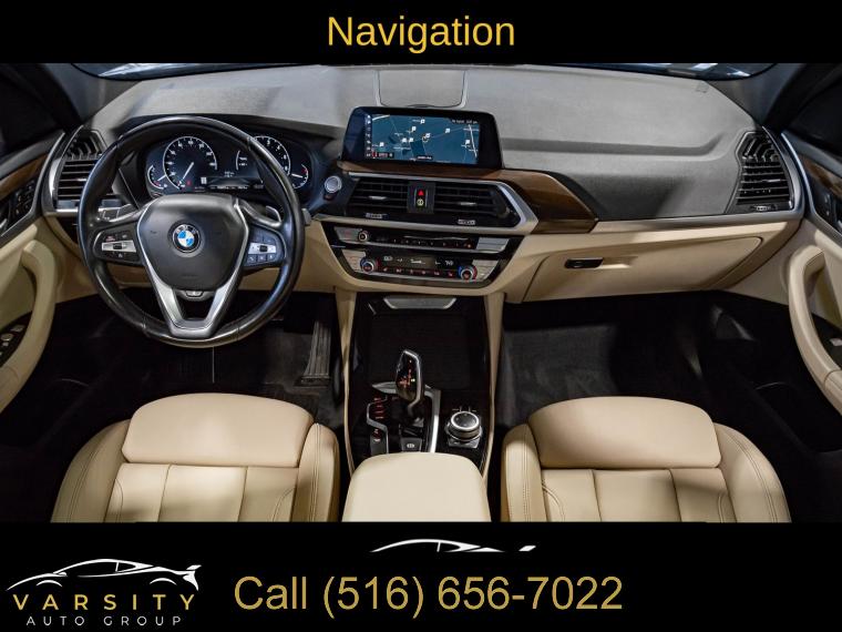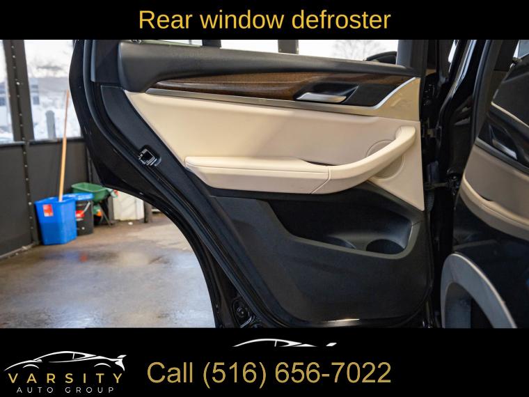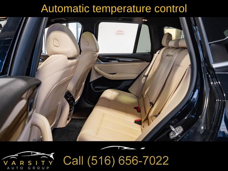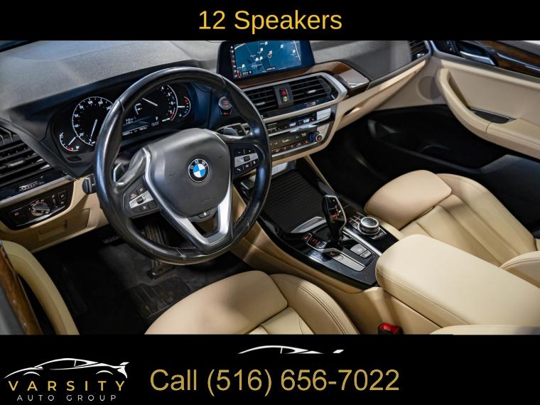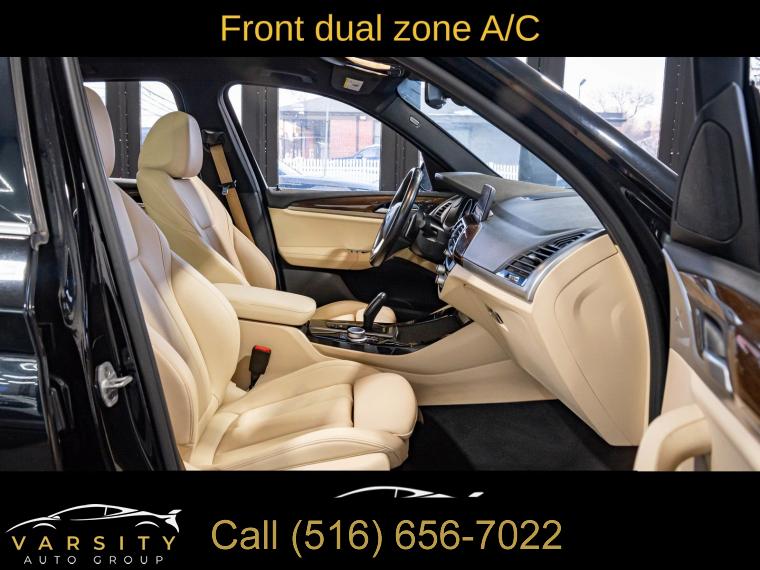 Navigation, Navigation System, Connected Package Plus, Convenience Package, M Sport Package (337), 12 Speakers, AM/FM radio: SiriusXM, Hi-Fi Sound System, Radio Control US, Radio data system, Radio: AM/FM Stereo w/HD, SiriusXM Satellite Radio, Air Conditioning, Automatic temperature control, Front dual zone A/C, Rear air conditioning, Rear window defroster, Comfort Access Keyless Entry, Lumbar Support, Memory seat, Power driver seat, Power steering, Power windows, Remote keyless entry, Steering wheel mounted audio controls, Four wheel independent suspension, Speed-sensing steering, Traction control, 4-Wheel Disc Brakes, ABS brakes, Dual front impact airbags, Dual front side impact airbags, Emergency communication system: BMW Assist eCall, Front anti-roll bar, Knee airbag, Low tire pressure warning, Occupant sensing airbag, Overhead airbag, Rear anti-roll bar, Panoramic Moonroof, Power Liftgate, Brake assist, Electronic Stability Control, Exterior Parking Camera Rear, Delay-off headlights, Front fog lights, Fully automatic headlights, Panic alarm, Security system, Speed control, Auto-dimming door mirrors, Bumpers: body-color, Heated door mirrors, Power door mirrors, Roof rack: rails only, Spoiler, Turn signal indicator mirrors, Apple CarPlay Compatibility, Auto-dimming Rear-View mirror, BMW Assist eCall, BMW TeleServices, ConnectedDrive Services, Driver door bin, Driver vanity mirror, Front reading lights, Garage door transmitter, Genuine wood dashboard insert, Genuine wood door panel insert, Heated Steering Wheel, Illuminated entry, Outside temperature display, Passenger vanity mirror, Rear reading lights, Rear seat center armrest, Sport steering wheel, Tachometer, Telescoping steering wheel, Tilt steering wheel, Trip computer, WiFi Hotspot, Front Bucket Seats, Front Center Armrest, Heated Front Seats, Power Front Seats, Power passenger seat, SensaTec Upholstery, Split folding rear seat, Sport Bucket Seats, Passenger door bin, Alloy wheels, Wheels: 18" x 7.0" Y-Spoke (Style 688), Wheels: 19" x 7.5" Y-Spoke (Style 693), Rain sensing wipers, Rear window wiper, Speed-Sensitive Wipers, Variably intermittent wipers, 3.385 Axle Ratio, 2021 BMW X3 xDrive30i, Jet Black, Canberra Beige/Black w/SensaTec Upholstery, Panoramic Moonroof.