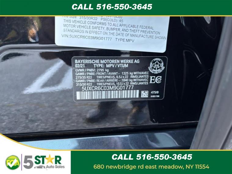For more information on this 2021 BMW X5, please call 5 Star Auto Sales at (516) 550-3645 or with the contact form on this page. This vehicle's vin number is 5UXCR6C03M9G01777 and is recorded as being in stock at 5 Star Auto Sales at 680 Newbridge Rd in East Meadow. See all cars from this dealership.