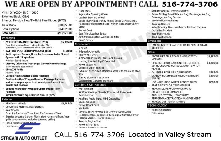 Navigation System, Battery Protection Package, Custom Leather Wrapped Interior Package, Memory Driver & Passenger Convenience Package, Preferred Equipment Group 3LT, Z51 Performance Package, Convertible HardTop, 14 Speakers, AM/FM radio: SiriusXM, Bose Performance Series Sound System w/14 Speakers, HD Radio, Radio data system, Radio: Chevrolet Infotainment 3 Premium System, SiriusXM Radio, Air Conditioning, Automatic temperature control, Front dual zone A/C, Rear window defroster, 8-Way Power Driver Seat Adjuster, 8-Way Power Passenger Seat Adjuster, Head-Up Display, Heads-Up Display, Memory seat, Power driver seat, Power steering, Power windows, Remote keyless entry, Steering wheel memory, Steering wheel mounted audio controls, Universal Home Remote, Electronic Limited-Slip Differential, Four wheel independent suspension, Front Lift Adjustable Height w/Memory, Speed-sensing steering, Traction control, Z51 Perf Suspension w/Magnetic Selective Ride Cntrl, 4-Wheel Disc Brakes, ABS brakes, Dual front impact airbags, Dual front side impact airbags, Edge Yellow-Painted Calipers, Emergency communication system: OnStar and Chevrolet connected services capable, Front anti-roll bar, Integrated roll-over protection, Low tire pressure warning, Occupant sensing airbag, Rear anti-roll bar, Z51 Performance Brakes, Brake assist, Electronic Stability Control, Performance Traction Management, Rear Parking Sensors, Delay-off headlights, Fully automatic headlights, Electrical Theft Deterrent System, Panic alarm, Security system, Tension Blue Seat Belt Color, Vehicle Inclination Theft Deterrent Sensor, Vehicle Interior Movement Theft Deterrent Sensor, Speed control, Heavy-Duty Cooling System, Auto-dimming door mirrors, Bumpers: body-color, Carbon Flash/Edge Yellow Stinger Stripe, Heated door mirrors, Performance Exhaust w/Stainless-Steel Tips, Power door mirrors, Power-Adjustable Outside Heated Mirrors, Rear Cross Traffic Alert, Rear Z51 Spoiler, Turn signal indicator mirrors, Z51 Performance Suspension, Auto-dimming Rear-View mirror, Carbon Fiber Interior Trim, Compass, Convertible roof lining, Driver door bin, Driver vanity mirror, Front reading lights, Garage door transmitter, GT2 Bucket Seats, HD Front & Rear Vision Cameras, Heated Steering Wheel, Heated steering wheel, Illuminated entry, Leather Shift Knob, Leather steering wheel, Outside temperature display, Overhead console, Passenger vanity mirror, Performance Data & Video Recorder, Power convertible roof, Sport steering wheel, Sueded Microfiber-Wrapped Upper Interior Trim Pkg, Tachometer, Telescoping steering wheel, Tilt steering wheel, Trip computer, Voltmeter, Wireless Apple CarPlay/Wireless Android Auto, Wireless Charging for Devices, Driver Power Bolster Seat Adjuster, Front Bucket Seats, Front Center Armrest, Heated & Vented Driver & Passenger Seats, Heated front seats, Napa Lthr Seating Surfaces w/Perforated Inserts, Passenger Power Bolster Seat Adjuster, Power Driver Lumbar Control Seat Adjuster, Power Passenger Lumbar Control Seat Adjuster, Power passenger seat, Ventilated front seats, 2 Cargo Nets, Passenger door bin, Alloy wheels, Jake Logo Wheel Center Caps (LPO), Wheels: 19" x 8.5" Fr/20" x 11" Rr Bright Silver, Wheels: 19" x 8.5" Fr/20" x 11" Rr Spectra Gray, Glass rear window, Side Blind Zone Alert, Variably intermittent wipers, Performance Rear Axle Ratio, * NYS INSPECTION INCLUDED *, * FULL INTERIOR / EXTERIOR DETAIL *, * BLUETOOTH *, * LIMITED NYS LEMON LAW WARRANTY INCLUDED *, *FRESH OIL CHANGE *, * 150 MULTI POINT INSPECTION *
