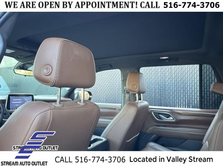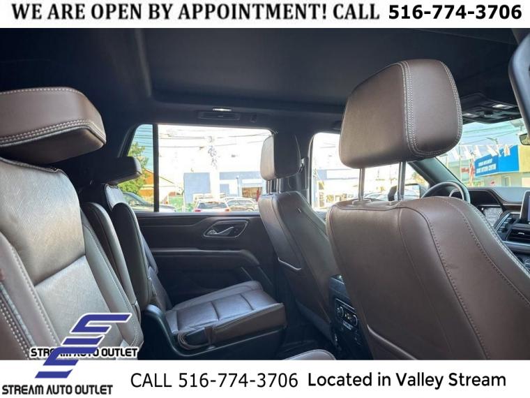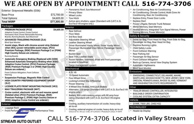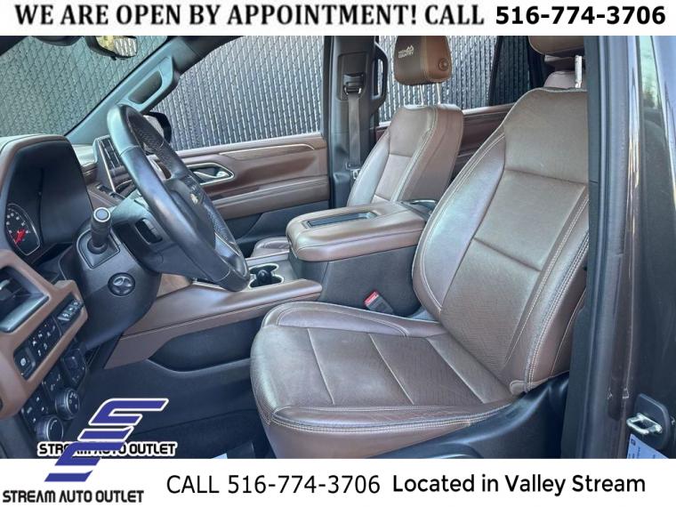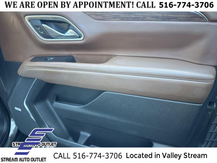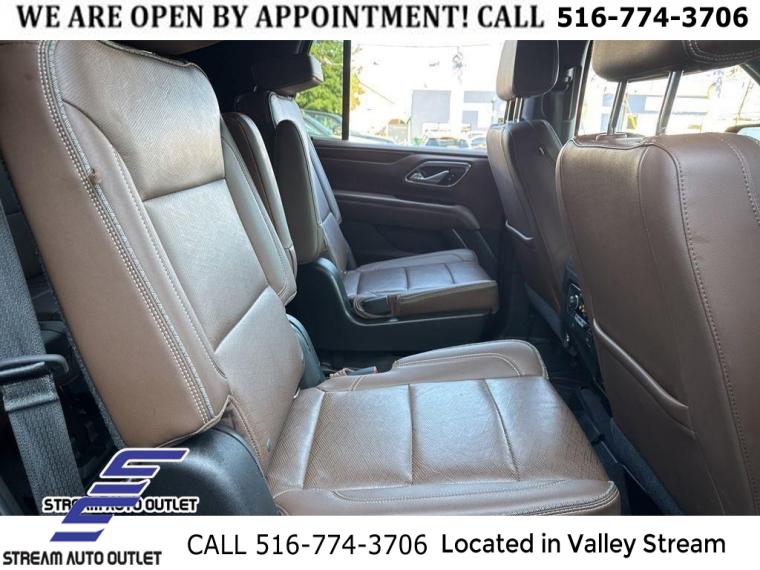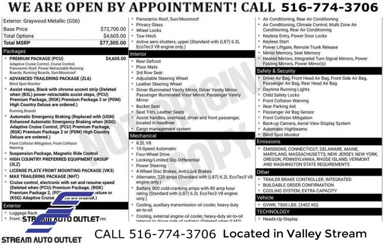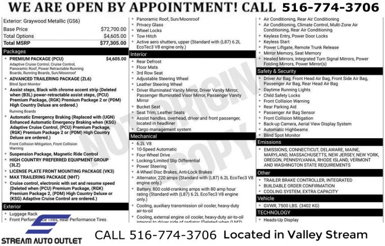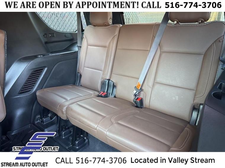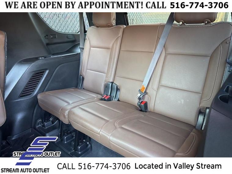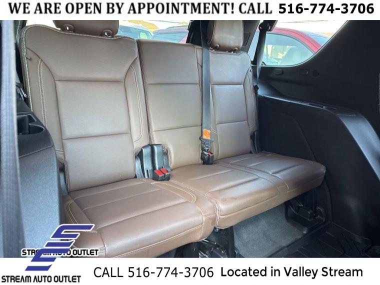 Navigation System, Advanced Trailering Package, License Plate Front Mounting Package, Max Trailering Package, Preferred Equipment Group 3LZ, Premium Package, 10 Speakers, AM/FM radio: SiriusXM with 360L, Bose 10-Speaker Centerpoint Surround Audio Sys Ft, HD Radio, Premium audio system: Chevrolet Infotainment 3, Radio: Chevrolet Infotainment 3 Premium System, SiriusXM Radio w/360L, Air Conditioning, Automatic temperature control, Front dual zone A/C, Rear air conditioning, Rear window defroster, Enhanced Driver Information Center, Hands-Free Rear Power Programmable Liftgate, Heads-Up Display, Memory seat, Memory Settings, Power driver seat, Power steering, Power windows, Remote keyless entry, Remote Start, Steering wheel memory, Steering wheel mounted audio controls, Universal Home Remote, Adaptive suspension, Auto-leveling suspension, Automatic Heated Steering Wheel, Four wheel independent suspension, Magnetic Ride Control Suspension, Speed-sensing steering, Traction control, 4-Wheel Disc Brakes, ABS brakes, Dual front impact airbags, Dual front side impact airbags, Emergency communication system: OnStar and Chevrolet connected services capable, Enhanced Automatic Emergency Braking, Front anti-roll bar, Low tire pressure warning, Occupant sensing airbag, Overhead airbag, Rear anti-roll bar, Dual-Pane Power Panoramic Sunroof, Power Liftgate, Brake assist, Electronic Stability Control, Front & Rear Park Assist, Hill Descent Control, Auto High-beam Headlights, Delay-off headlights, Fully automatic headlights, LED Daytime Running Lamps, Driver & Front Outboard Passenger Airbags, Panic alarm, Security system, Adaptive Cruise Control, Speed control, 2-Speed Active Electronic AutoTrac Transfer Case, Extra Capacity Cooling System, Auto-dimming door mirrors, Bright Front & Rear Door Sill Plates, Bumpers: body-color, Chrome Door Handles w/Body-Color Strip, Dual Exhaust System, Heated door mirrors, Outside Heated Power-Adjustable Mirrors, Power door mirrors, Power-Retractable Assist Steps, Roof rack: rails only, Spoiler, Trailer Side Blind Zone Alert, Turn signal indicator mirrors, 15" Diagonal Multi-Color Head-Up Display, 1st & 2nd Row Color-Keyed Carpeted Floor Mats, 2 USB Data Ports, Apple CarPlay/Android Auto, Auto-dimming Rear-View mirror, Color-Keyed Carpeting Floor Covering, Compass, Driver door bin, Driver vanity mirror, Front reading lights, Garage door transmitter, HD Surround Vision, Heated steering wheel, Illuminated entry, Infotainment Display, Inside Rearview Auto-Dimming Rear Camera Mirror, Lane Change Alert w/Side Blind Zone Alert, Lane Keep Assist w/Lane Departure Warning, Leather steering wheel, Leather-Wrapped Steering Wheel, Outside temperature display, Overhead console, Passenger vanity mirror, Power Tilt & Telescopic Steering Column, Rear Camera Mirror Washer, Rear Cross Traffic Alert, Rear Pedestrian Alert, Rear reading lights, Safety Alert Seat, SiriusXM NavTraffic, Tachometer, Telescoping steering wheel, Tilt steering wheel, Trip computer, Voltmeter, 12-Way Power Driver & Passenger Seat Adjusters, 3rd Row 60/40 Power-Folding Split-Bench Seat, 3rd row seats: split-bench, Floor Console w/Storage Area, Front Bucket Seats, Front Center Armrest, Front High-Back Reclining Bucket Seats, Heated & Ventilated Driver & Front Passenger Seats, Heated 2nd Row Outboard Seats, Heated Driver & Front Passenger Seats, Heated front seats, Heated rear seats, Perforated Leather Seat Trim, Power passenger seat, Power Release 2nd Row Bucket Seats, Split folding rear seat, Ventilated front seats, Passenger door bin, Advanced Trailering System, Hitch Guidance w/Hitch View, Integrated Trailer Brake Controller, Alloy wheels, Set of 4 Wheel Locks (LPO), Wheels: 22" x 9" Sterling Silver Premium Painted, Rain sensing wipers, Rear window wiper, Variably intermittent wipers, 3.23 Rear Axle Ratio, * NYS INSPECTION INCLUDED *, * FULL INTERIOR / EXTERIOR DETAIL *, * BLUETOOTH *, * LIMITED NYS LEMON LAW WARRANTY INCLUDED *, *FRESH OIL CHANGE *, * 150 MULTI POINT INSPECTION *