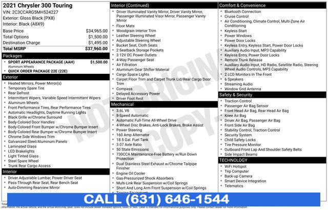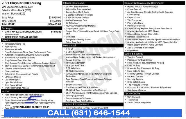 2021 Chrysler 300 Gloss Black * NYS INSPECTION INCLUDED *, * FULL INTERIOR / EXTERIOR DETAIL *, * BLUETOOTH *, * LIMITED NYS LEMON LAW WARRANTY INCLUDED *, *FRESH OIL CHANGE *, * 150 MULTI POINT INSPECTION *, AM/FM radio: SiriusXM, Apple CarPlay/Android Auto, Black Chrome Surround 300S Grille, Black Headlamp Bezels, Black LED Taillamps, Black Noise 300 Badge, Black Noise AWD Badge, Black Noise Wing Badges - Black Insert, Gloss Black DLO Surround Molding, ParkView Rear Back-Up Camera, Power driver seat, Quick Order Package 22E, Sport Appearance Package, Wheels: 19" x 7.5" Black Noise Painted. Odometer is 19488 miles below market average! 18/27 City/Highway MPG Priced below KBB Fair Purchase Price!
