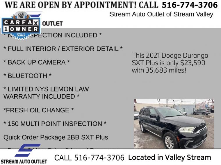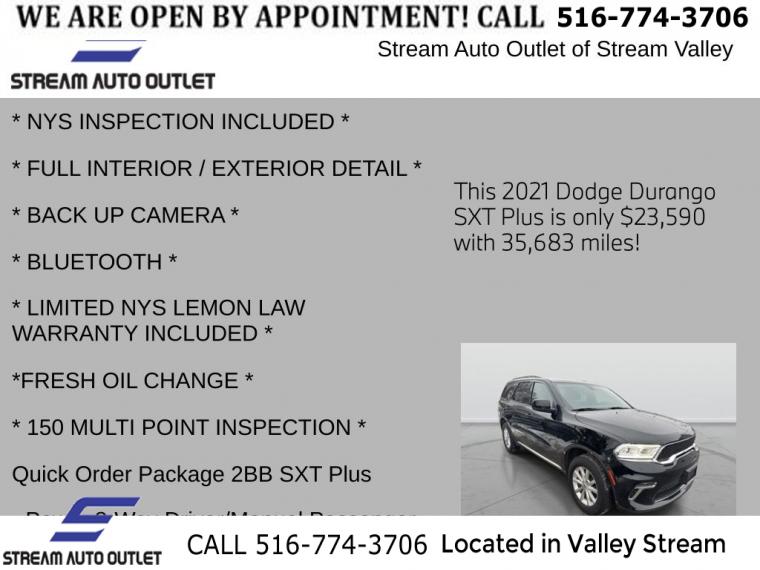 For more information on this 2021 Dodge Durango, please call Stream Auto Outlet Valley Stream at (516) 774-3706 or with the contact form on this page. This vehicle's vin number is 1C4RDJAG5MC558783 and is recorded as being in stock at Stream Auto Outlet Valley Stream at 324 W Merrick Rd in Valley Stream. See all cars from this dealership.