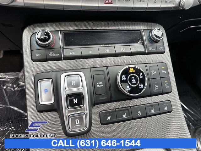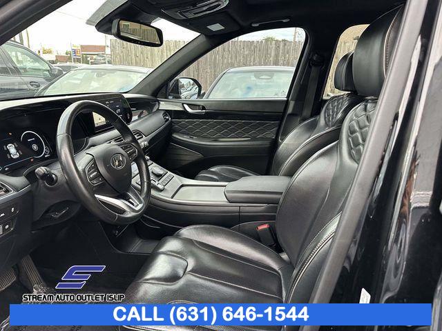Navigation System, Option Group 01, 12 Speakers, AM/FM radio: SiriusXM, harman/kardonĀ® Speakers, Radio data system, Radio: AM/FM/MP3 Premium Audio System, Air Conditioning, Automatic temperature control, Front dual zone A/C, Rear air conditioning, Rear window defroster, Heads-Up Display, Memory seat, Power driver seat, Power steering, Power windows, Remote keyless entry, Steering wheel mounted audio controls, Auto-leveling suspension, Four wheel independent suspension, Speed-sensing steering, Traction control, 4-Wheel Disc Brakes, ABS brakes, Dual front impact airbags, Dual front side impact airbags, Emergency communication system: Blue Link Connected Car Service (3-year complimentary subscription), Front anti-roll bar, Knee airbag, Low tire pressure warning, Occupant sensing airbag, Overhead airbag, Rear anti-roll bar, Power moonroof, Bumper Applique, Power Liftgate, Brake assist, Electronic Stability Control, Auto High-beam Headlights, Delay-off headlights, Fully automatic headlights, First Aid Kit, Panic alarm, Security system, Speed control, Bumpers: body-color, Heated door mirrors, Mudguards, Power door mirrors, Spoiler, Turn signal indicator mirrors, Apple CarPlay & Android Auto, Auto-dimming Rear-View mirror, Carpeted Floor Mats, Compass, Driver door bin, Driver vanity mirror, Front reading lights, Garage door transmitter: HomeLink, Heated steering wheel, Illuminated entry, Outside temperature display, Overhead console, Passenger vanity mirror, Rear reading lights, Tachometer, Telescoping steering wheel, Tilt steering wheel, Trip computer, 3rd row seats: split-bench, Front Bucket Seats, Front Center Armrest, Heated & Ventilated Front Bucket Seats, Heated front seats, Heated rear seats, Power passenger seat, Premium Nappa Leather Seat Trim, Reclining 3rd row seat, Split folding rear seat, Ventilated front seats, Ventilated rear seats, Cargo Cover/Screen, Cargo Net, Passenger door bin, Alloy wheels, Wheel Locks, Wheels: 20" x 7.5J Calligraphy Exclusive Alloy, Rain sensing wipers, Rear window wiper, Variably intermittent wipers, 3.648 Axle Ratio