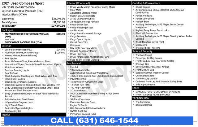 CARFAX One-Owner. Clean CARFAX. 2021 Jeep Compass Laser Blue Pearlcoat 4WD, Apple CarPlay/Android Auto, Heated door mirrors, Illuminated entry, ParkView Rear Back-Up Camera. 22/30 City/Highway MPG Priced below KBB Fair Purchase Price!