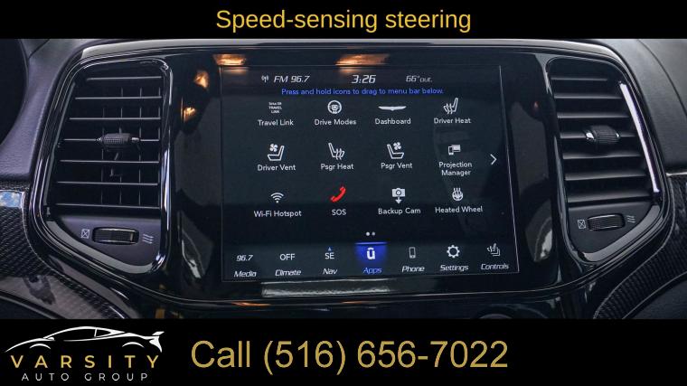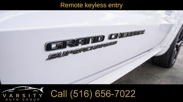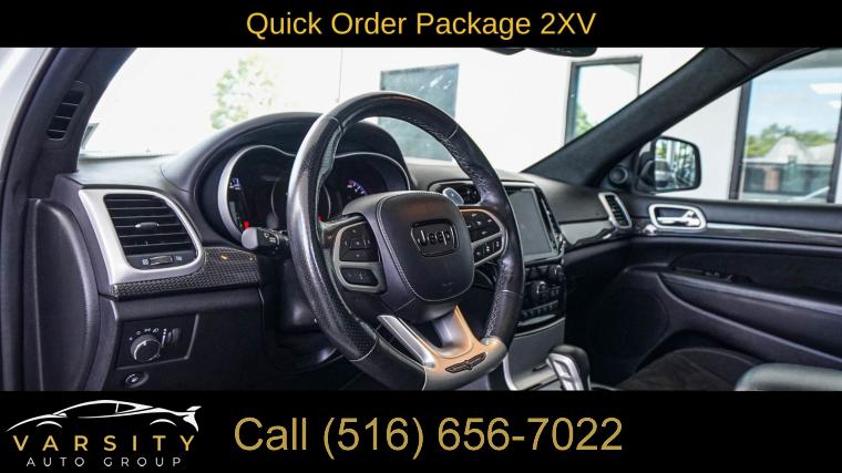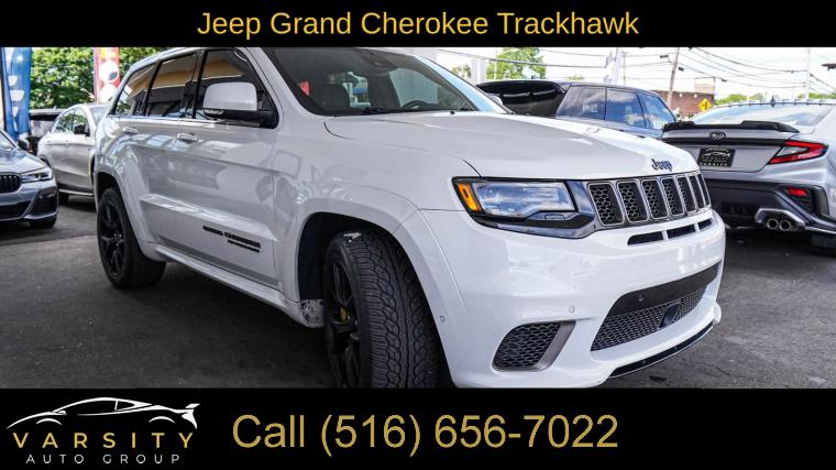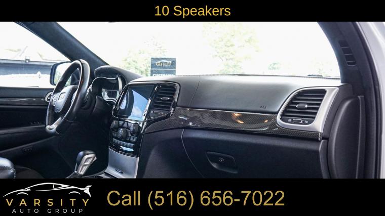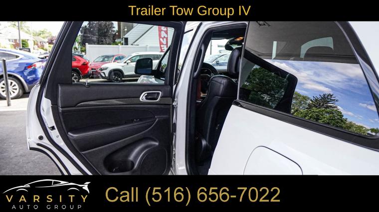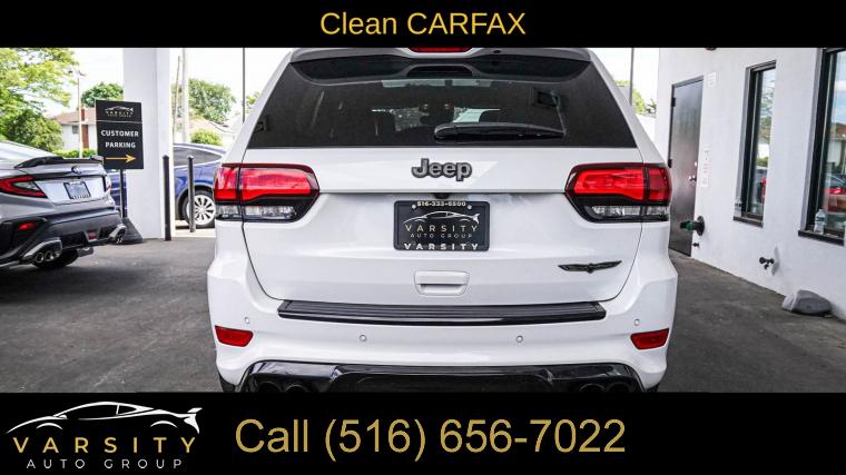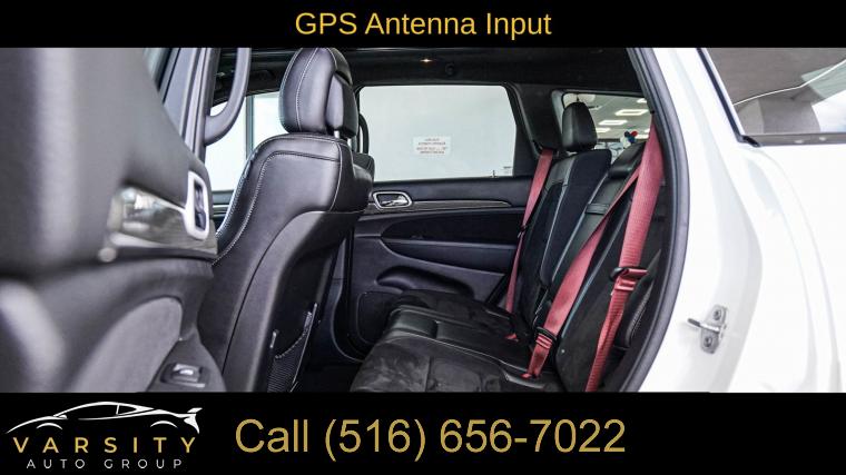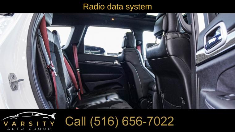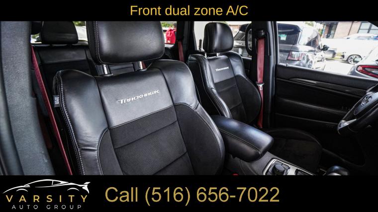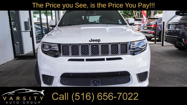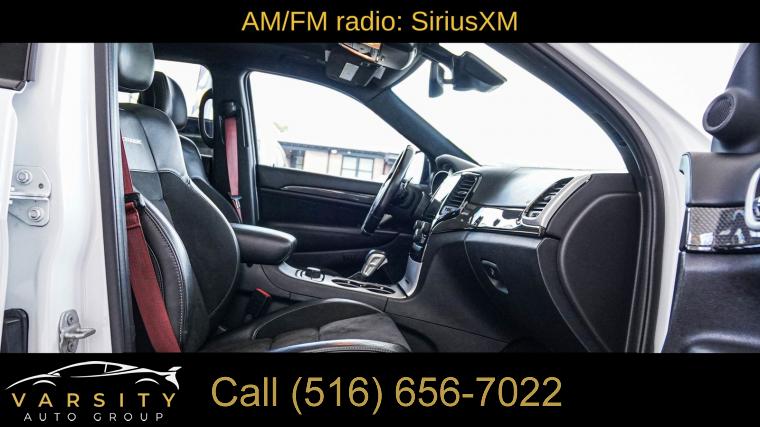 GPS Navigation, Navigation System, Quick Order Package 2XV, Trailer Tow Group IV, 10 Speakers, AM/FM radio: SiriusXM, Audio memory, GPS Antenna Input, HD Radio, Radio data system, Radio: Uconnect 4C Nav w/8.4" Display, SiriusXM Satellite Radio, Air Conditioning, Automatic temperature control, Front dual zone A/C, Rear window defroster, Memory seat, Power driver seat, Power steering, Power windows, Remote keyless entry, Steering wheel mounted audio controls, Adaptive suspension, Competition Suspension, Four wheel independent suspension, Speed-sensing steering, Traction control, 4-Wheel Disc Brakes, ABS brakes, Anti-whiplash front head restraints, Dual front impact airbags, Dual front side impact airbags, Emergency communication system: SiriusXM Guardian, Front anti-roll bar, Knee airbag, Low tire pressure warning, Occupant sensing airbag, Overhead airbag, Rear anti-roll bar, Dual-Pane Panoramic Sunroof, Power Liftgate, Brake assist, Electronic Stability Control, ParkView Rear Back-Up Camera, Auto High-beam Headlights, Delay-off headlights, Fully automatic headlights, Headlight cleaning, High intensity discharge headlights: Bi-Xenon, Panic alarm, Red Seat Belts, Security system, Speed control, Heavy-Duty Engine Cooling, Auto-dimming door mirrors, Front License Plate Bracket, Heated door mirrors, Power door mirrors, Spoiler, Turn signal indicator mirrors, 1-Year SiriusXM Guardian Trial, 4G LTE Wi-Fi Hot Spot, 8.4" Touchscreen Display, Apple CarPlay, Apple CarPlay/Android Auto, Auto-dimming Rear-View mirror, Compass, Driver door bin, Driver vanity mirror, Front reading lights, Garage door transmitter, Google Android Auto, Heated steering wheel, Illuminated entry, Integrated Voice Command w/Bluetooth, Leather Shift Knob, Outside temperature display, Overhead console, Passenger vanity mirror, Premium Headliner Module, Rear reading lights, Rear seat center armrest, SiriusXM Traffic Plus, SiriusXM Travel Link, Suede/Nappa Performance Seats, Tachometer, Telescoping steering wheel, Tilt steering wheel, Trip computer, Front Bucket Seats, Heated front seats, Heated rear seats, Power passenger seat, Split folding rear seat, Ventilated front seats, Front Center Armrest w/Storage, Passenger door bin, 7 & 4 Pin Wiring Harness, Class IV Receiver Hitch, Alloy wheels, Wheels: 20" x 10.0" Black Satin Aluminum, Rain sensing wipers, Rear window wiper, Speed-Sensitive Wipers, Variably intermittent wipers, 3.70 Rear Axle Ratio, The Price you See, is the Price You Pay!!!, Jeep Grand Cherokee Trackhawk, 6.2L Supercharged HEMI V8, Clean CARFAX, Low Miles