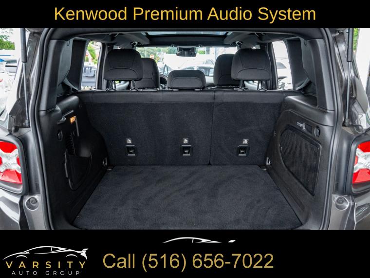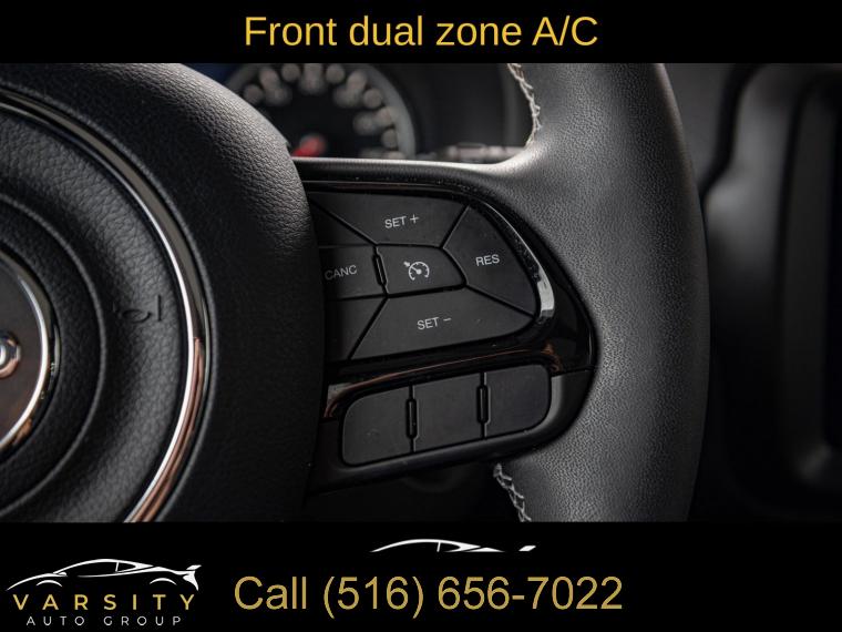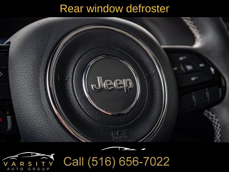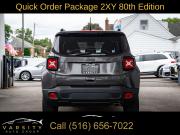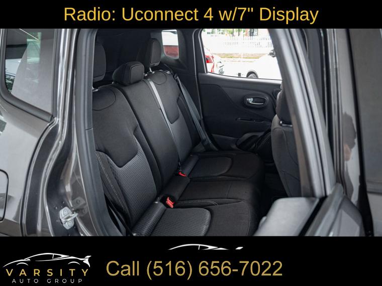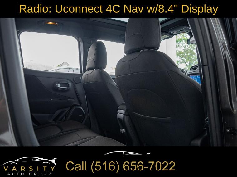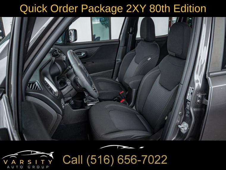 GPS Navigation, Quick Order Package 2XY 80th Edition, Sun & Sound Group (DISC), 6 Speakers, AM/FM radio: SiriusXM, HD Radio, Kenwood Premium Audio System, Radio data system, Radio: Uconnect 4 w/7" Display, Radio: Uconnect 4C Nav w/8.4" Display, Air Conditioning, Automatic temperature control, Front dual zone A/C, Rear window defroster, Power steering, Power windows, Remote keyless entry, Steering wheel mounted audio controls, Four wheel independent suspension, Gloss Black Steering Wheel Bezel, Normal Duty Suspension, Traction control, 4-Wheel Disc Brakes, ABS brakes, Anti-whiplash front head restraints, Dual front impact airbags, Dual front side impact airbags, Emergency communication system: SiriusXM Guardian, Front anti-roll bar, Knee airbag, Low tire pressure warning, Occupant sensing airbag, Overhead airbag, Rear anti-roll bar, Dual-Pane Panoramic Power Sunroof, Brake assist, Electronic Stability Control, ParkView Rear Back-Up Camera, Delay-off headlights, Front fog lights, Fully automatic headlights, Panic alarm, Security system, Speed control, Accent Color Exterior Mirrors, Granite Crystal Jeep Badge, Heated door mirrors, Jeep 80th Anniversary Instrumental Panel Badge, Power door mirrors, Protective Clear Plastic Film - 2 (DISC), Roof rack: rails only, Satin Granite Exterior Accents, Spoiler, 1-Year SiriusXM Guardian Trial, 5-Year SiriusXM Traffic Service, 5-Year SiriusXM Travel Link Service, 8.4" Touchscreen Display, 80th Edition Premium Cloth Bucket Seats, Apple CarPlay/Android Auto, Berber Floor Mats w/80th Anniversary Tag, Black Headliner, Compass, Driver door bin, Driver vanity mirror, For Details, Visit DriveUconnect.com, Front reading lights, Illuminated entry, Jeep 80th Anniversary Edition, Outside temperature display, Passenger vanity mirror, SiriusXM Traffic Plus, SiriusXM Travel Link, Tachometer, Telescoping steering wheel, Tilt steering wheel, Trip computer, Voltmeter, Front Bucket Seats, Front Center Armrest, Manual Adjust 4-Way Front Passenger Seat, Premium Cloth Bucket Seats, Split folding rear seat, Passenger door bin, Satin Granite Roof Rails, 17" x 7.0" Aluminum Wheels, Alloy wheels, Wheels: 19" x 7.5" Granite Painted Aluminum, Rear window wiper, Variably intermittent wipers, 3.734 Final Drive Ratio, 2021 Jeep Renegade 80th Anniversary Edition, Granite Crystal Metallic Clearcoat, Black w/Cloth Low-Back Bucket Seats, One Owner, Low Miles