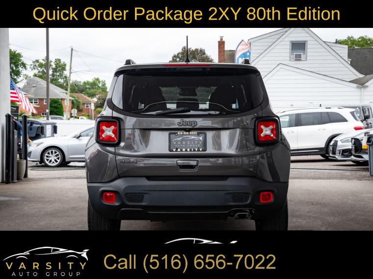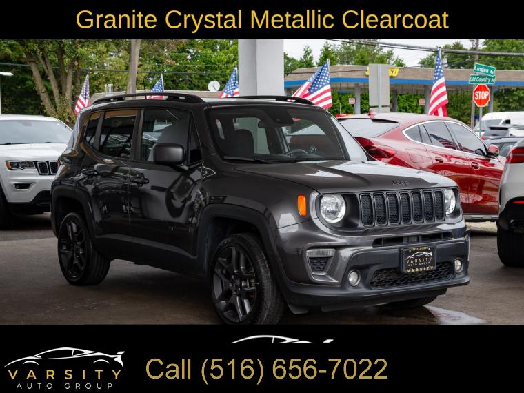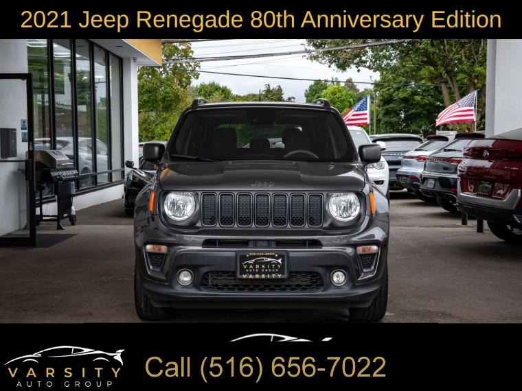 2021 Jeep Renegade 80th Anniversary Edition, Granite Crystal Metallic Clearcoat, Black w/Cloth Low-Back Bucket Seats, Quick Order Package 2XY 80th Edition, Sun & Sound Group (DISC), One Owner, Low Miles, 1-Year SiriusXM Guardian Trial, 17" x 7.0" Aluminum Wheels, 3.734 Final Drive Ratio, 4-Wheel Disc Brakes, 5-Year SiriusXM Traffic Service, 5-Year SiriusXM Travel Link Service, 6 Speakers, 8.4" Touchscreen Display, 80th Edition Premium Cloth Bucket Seats, ABS brakes, Accent Color Exterior Mirrors, Air Conditioning, Alloy wheels, AM/FM radio: SiriusXM, Anti-whiplash front head restraints, Apple CarPlay/Android Auto, Automatic temperature control, Berber Floor Mats w/80th Anniversary Tag, Black Headliner, Brake assist, Compass, Delay-off headlights, Driver door bin, Driver vanity mirror, Dual front impact airbags, Dual front side impact airbags, Dual-Pane Panoramic Power Sunroof, Electronic Stability Control, Emergency communication system: SiriusXM Guardian, For Details, Visit DriveUconnect.com, Four wheel independent suspension, Front anti-roll bar, Front Bucket Seats, Front Center Armrest, Front dual zone A/C, Front fog lights, Front reading lights, Fully automatic headlights, Gloss Black Steering Wheel Bezel, GPS Navigation, Granite Crystal Jeep Badge, HD Radio, Heated door mirrors, Illuminated entry, Jeep 80th Anniversary Edition, Jeep 80th Anniversary Instrumental Panel Badge, Kenwood Premium Audio System, Knee airbag, Low tire pressure warning, Manual Adjust 4-Way Front Passenger Seat, Normal Duty Suspension, Occupant sensing airbag, Outside temperature display, Overhead airbag, Panic alarm, ParkView Rear Back-Up Camera, Passenger door bin, Passenger vanity mirror, Power door mirrors, Power steering, Power windows, Premium Cloth Bucket Seats, Protective Clear Plastic Film - 2 (DISC), Quick Order Package 2XY 80th Edition, Radio data system, Radio: Uconnect 4 w/7" Display, Radio: Uconnect 4C Nav w/8.4" Display, Rear anti-roll bar, Rear window defroster, Rear window wiper, Remote keyless entry, Roof rack: rails only, Satin Granite Exterior Accents, Satin Granite Roof Rails, Security system, SiriusXM Traffic Plus, SiriusXM Travel Link, Speed control, Split folding rear seat, Spoiler, Steering wheel mounted audio controls, Sun & Sound Group (DISC), Tachometer, Telescoping steering wheel, Tilt steering wheel, Traction control, Trip computer, Variably intermittent wipers, Voltmeter, Wheels: 19" x 7.5" Granite Painted Aluminum. Granite Crystal Metallic Clearcoat 2021 Jeep Renegade 80th Anniversary Edition 4WD 9-Speed 948TE Automatic 2.4L I4 21/29 City/Highway MPG